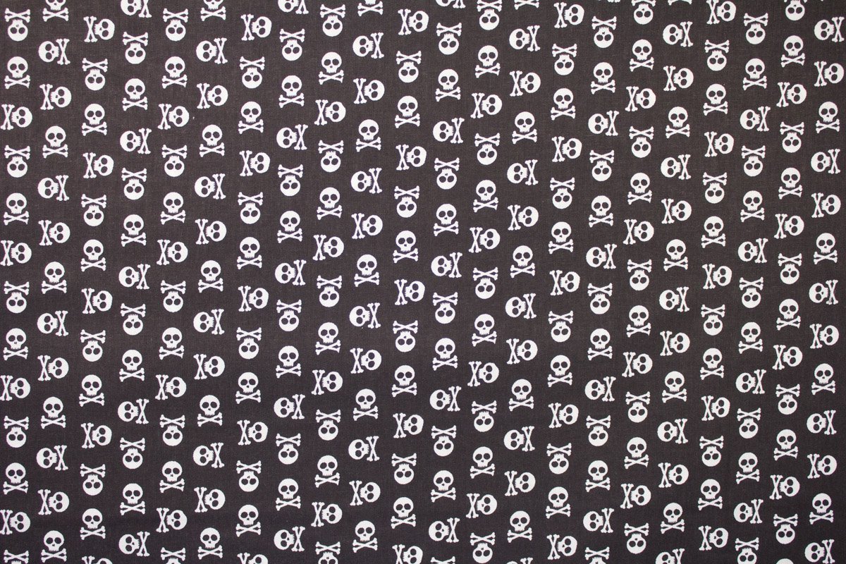 In schwarz und weiß gehalten ist dieser Baumwollstoff bedeckt mit kleinen Totenköpfen und Kreuzen aus Knochen.