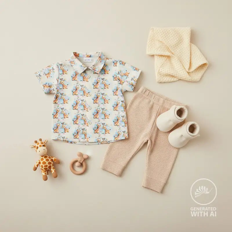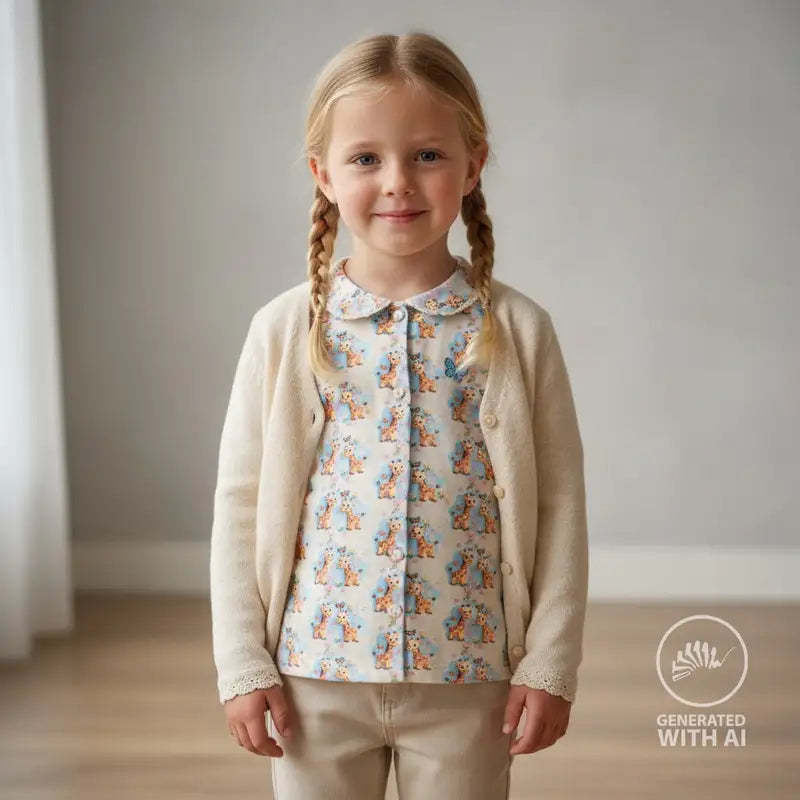 Niedliche kleine Giraffen zwischen Blümchen und Schmetterlingen auf hell mintfarbenem Hintergrund.