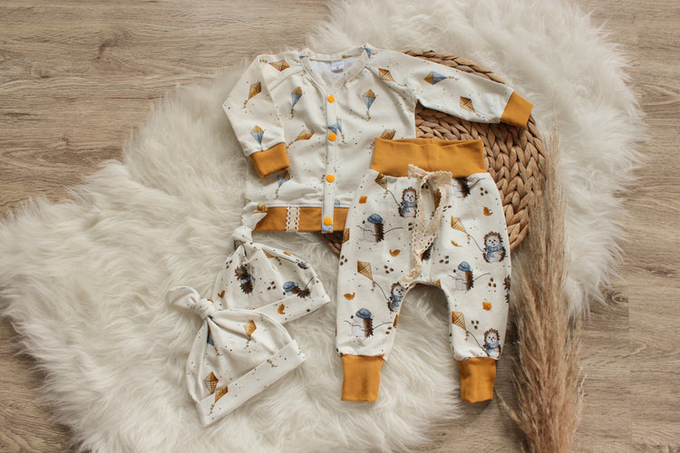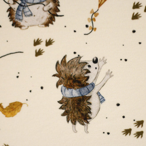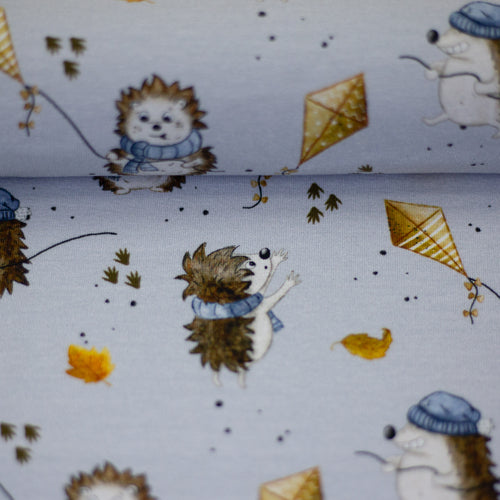 Das Eichhörnchen und das passende Eichel-Design gibt es in Naturweiß und einem schönen Schilfton, die Igel und ihre Drachen auf Naturweiß und Grau/Blau.