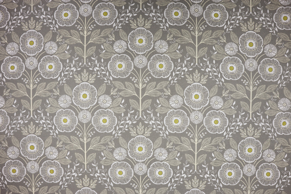 Schönes Muster mit Blüten in zarten hellen Farben auf taupe farbenem Hintergrund.