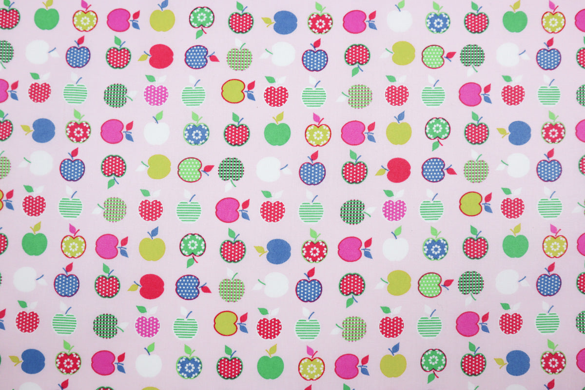 Niedliche kleine , gemusterte Äpfel auf rosafarbenem Hintergrund.