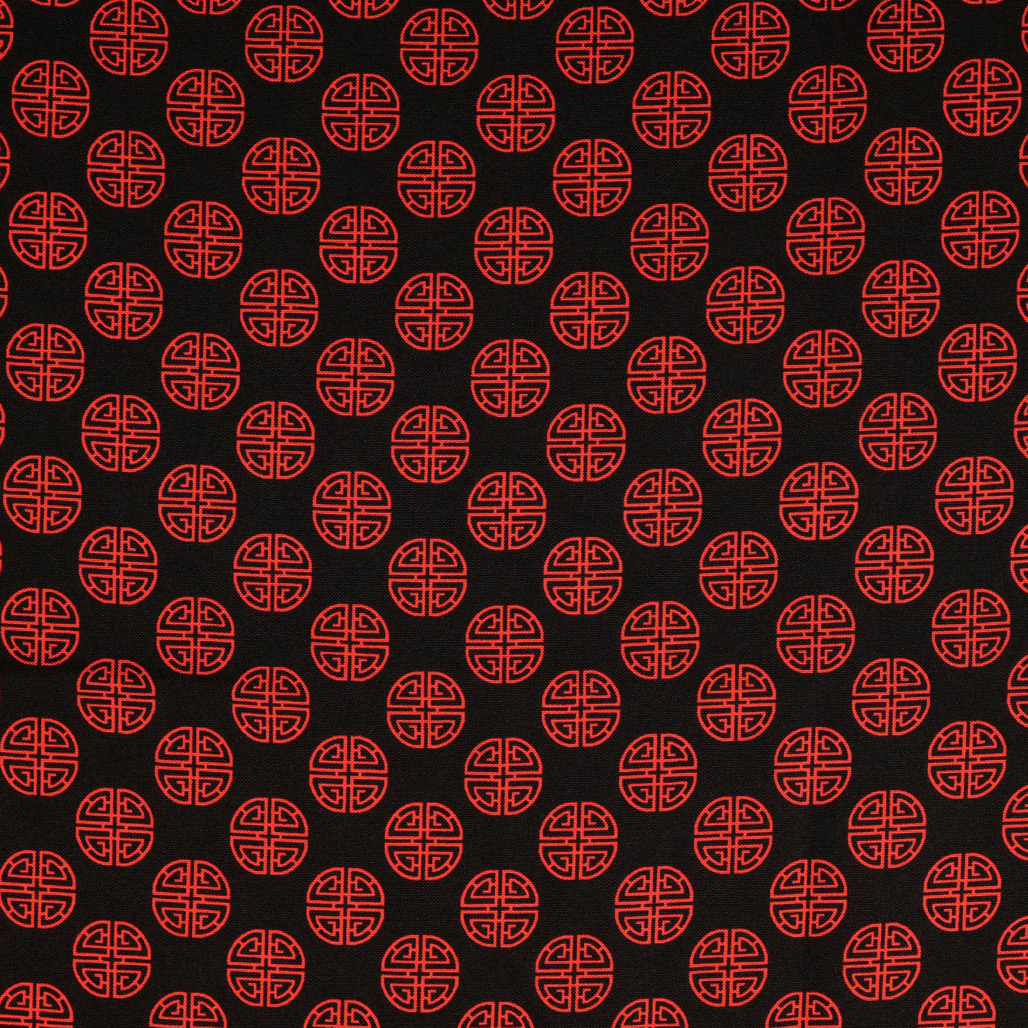 Design mit fernöstlich angehauchten roten Symbolen auf schwarzem Grund.