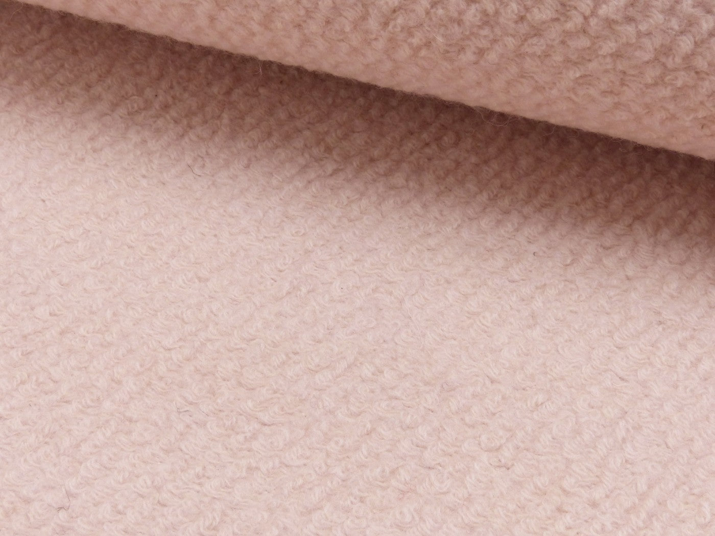 Boucle hat eine schlingenartige Oberfläche, ist wenig empfindlich und knittert kaum. Der Stoff ist besonders leicht zu verarbeiten, da die Schnittstellen nicht fransen.