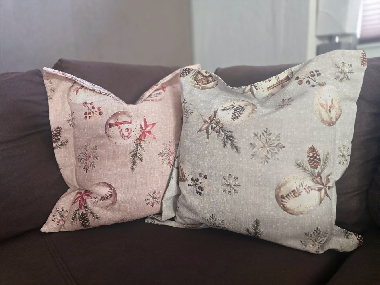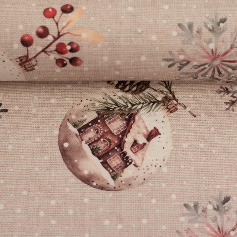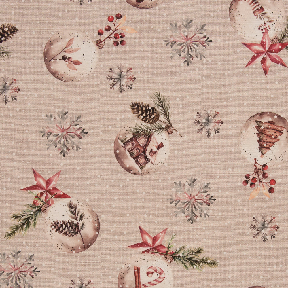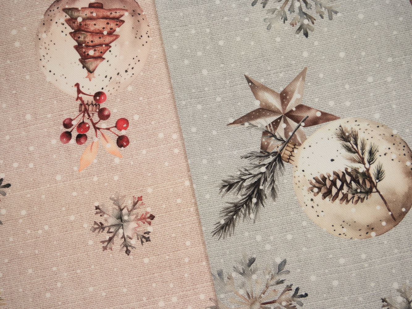 Weihnachtskugeln: Klassisch-festlich, wahlweise auf beige-meliertem oder grau-meliertem Grund. Die Kugeln wirken stilvoll und elegant – ideal für Taschen, Tischdecken oder weihnachtliche Homedeko.