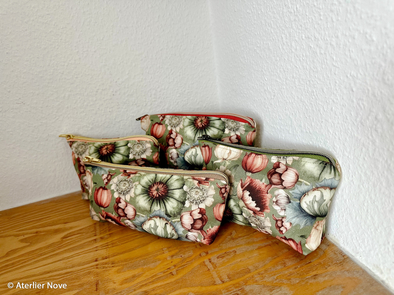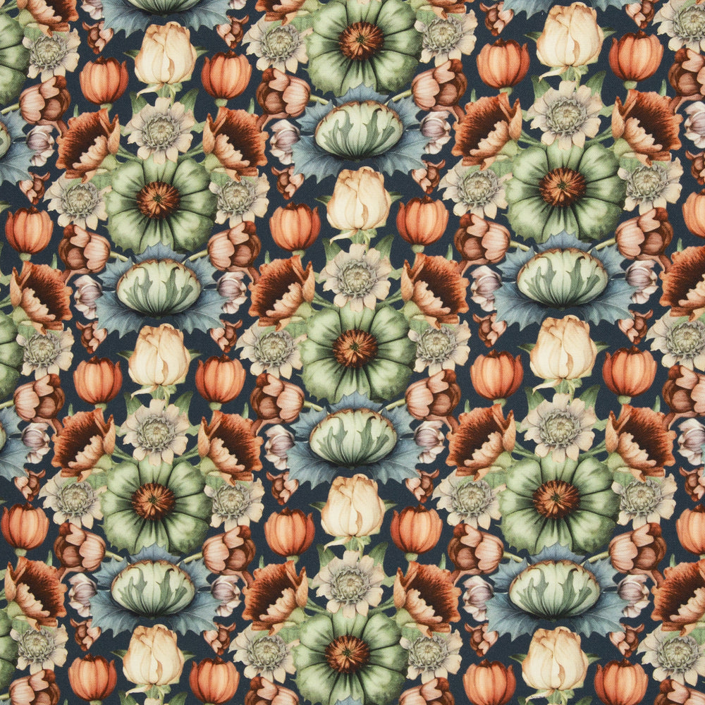 Die üppigen Blumen blühen auf unserem schönen Canvas in drei Farben – Beige, Dunkelblau und ein helles Schilfgrün. Die Vintagetöne passen so gut in die kommende, gemütliche Jahreszeit.