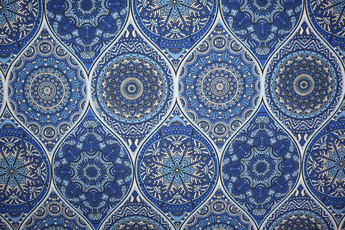 Super schöner Dekostoff mit großen Mandalas in kräftigen Blautönen.