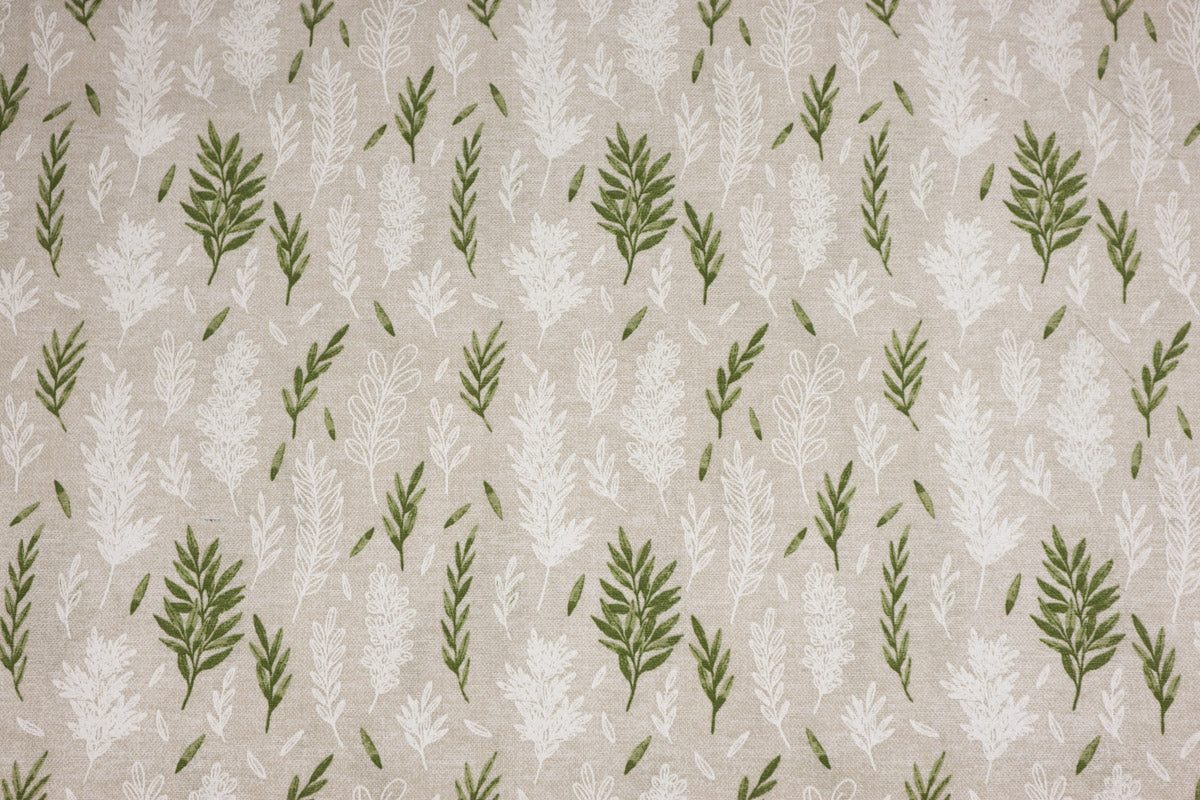 Schöner Dekostoff mit grünen und weißen Blättern auf beigem Grund.