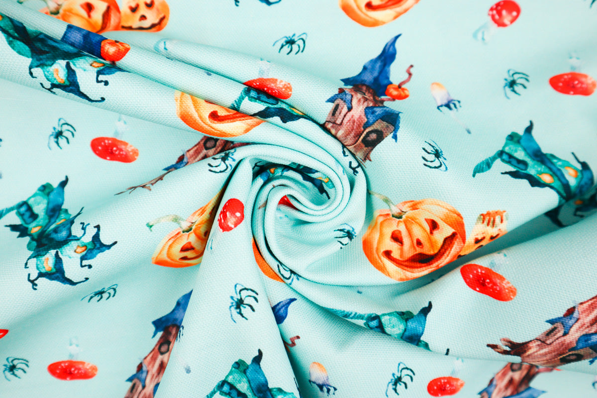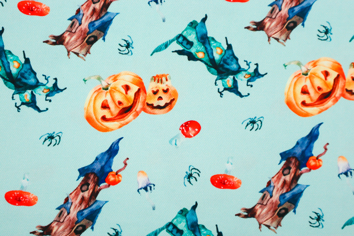 Richtig cooler Canvas mit gruseligem Motiv. Kleine Spinnen tummeln sich im Gruselwald zwischen Kürbissen und Pilzen auf mintfarbenem Hintergrund.
