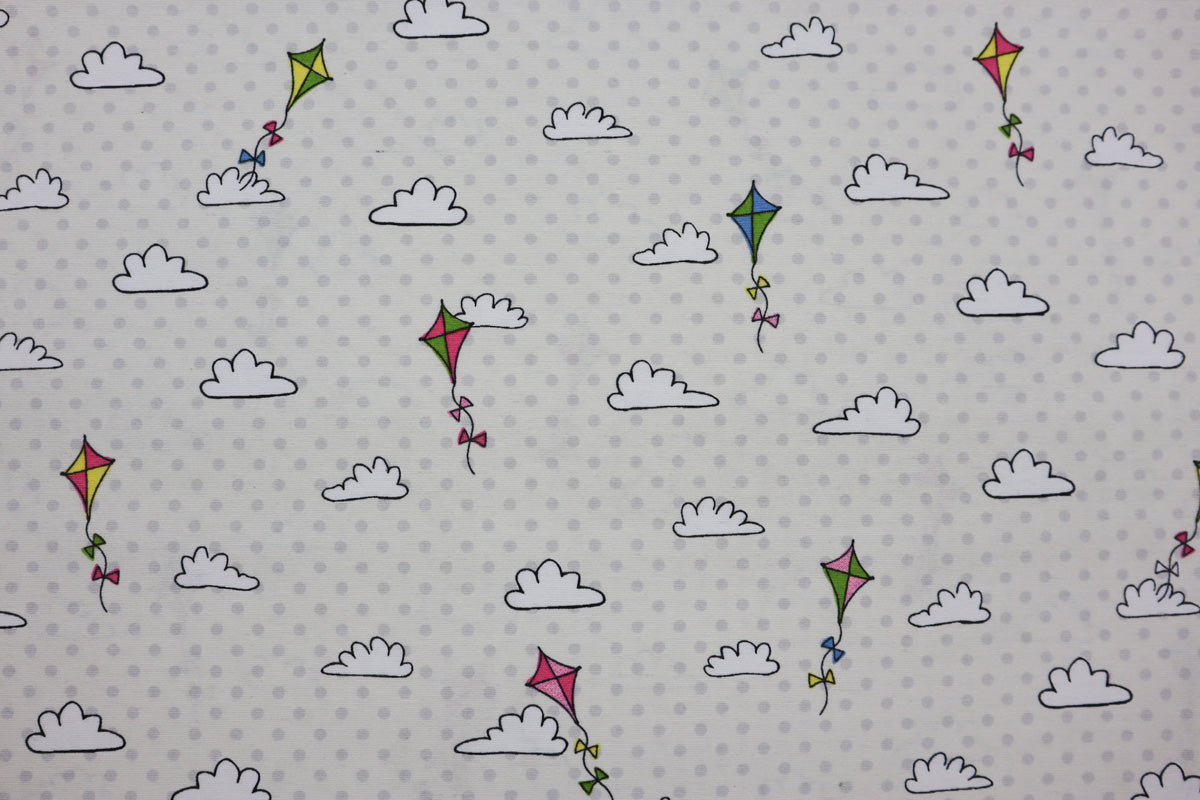 Schönes gepunktetes Muster mit kleinen Wolken und bunten Drachen.