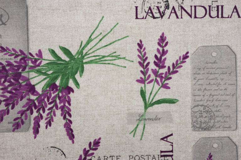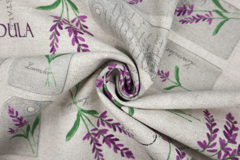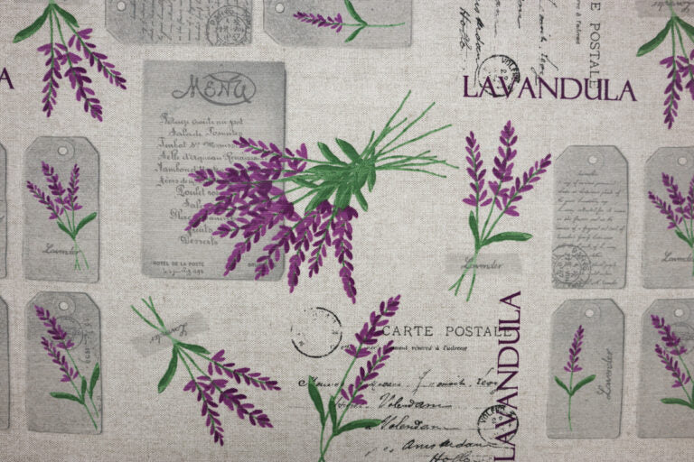Super schöner, leichter Dekostoff mit schönem Postkarten und Lavendel Muster.