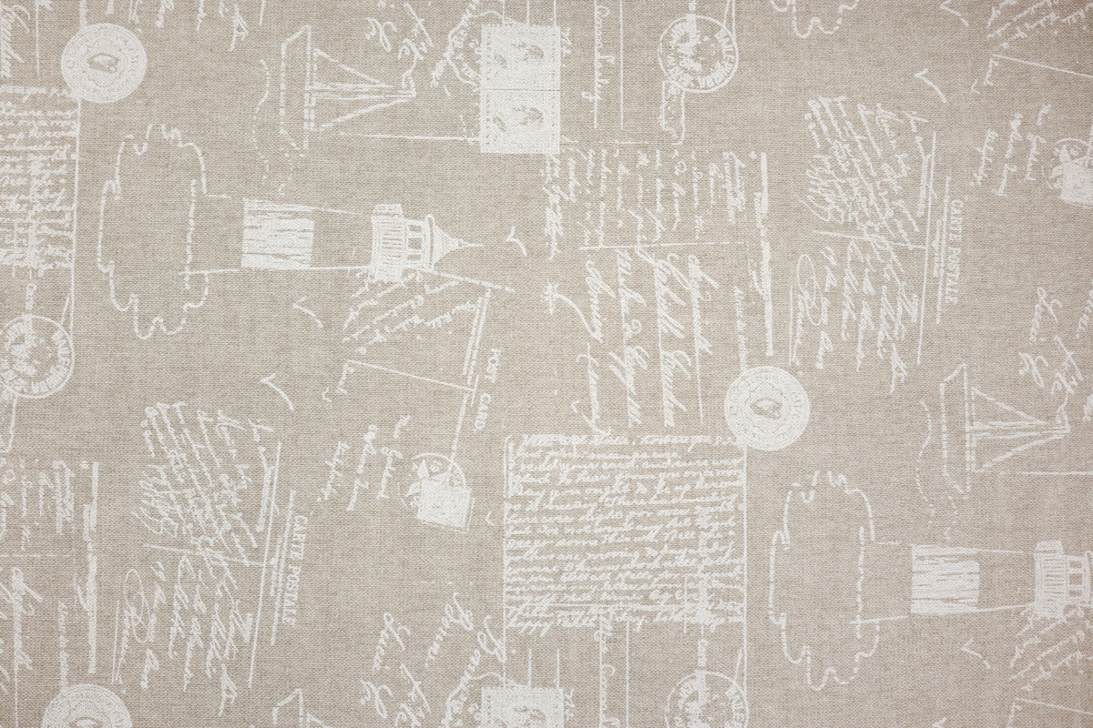 Super schöner maritimer Dekostoff mit weißer Schrift, Postkarten und Leuchttürmen.