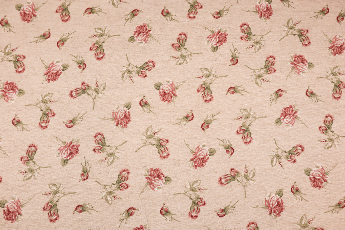 Super schöner Dekostoff mit kleinen Röschen auf beigem Hintergrund.