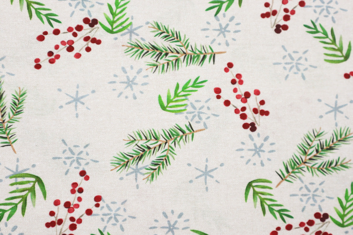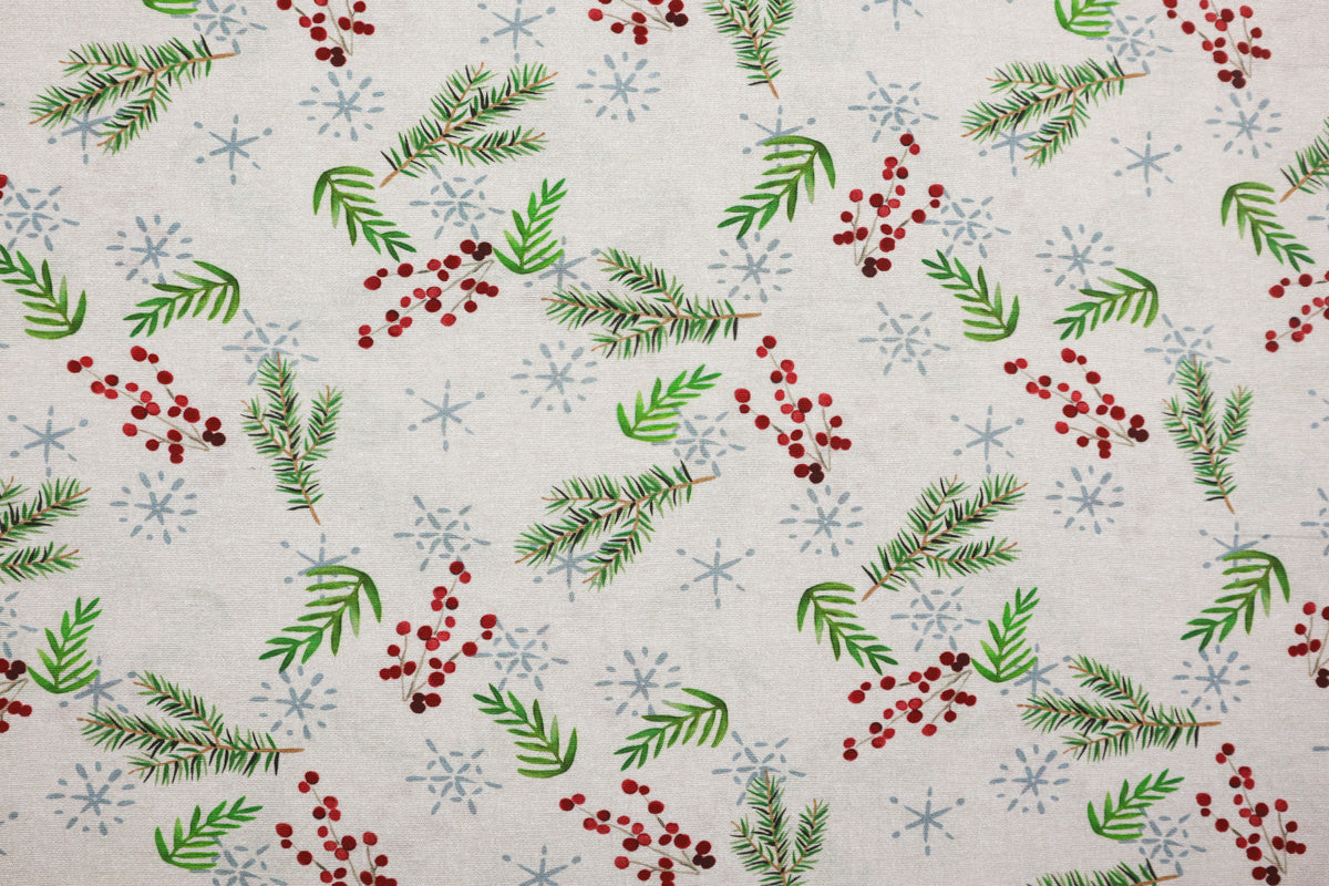 Schöner, winterlicher Dekostoff verschiedenen Zweigen, Beeren und Eiskristallen.