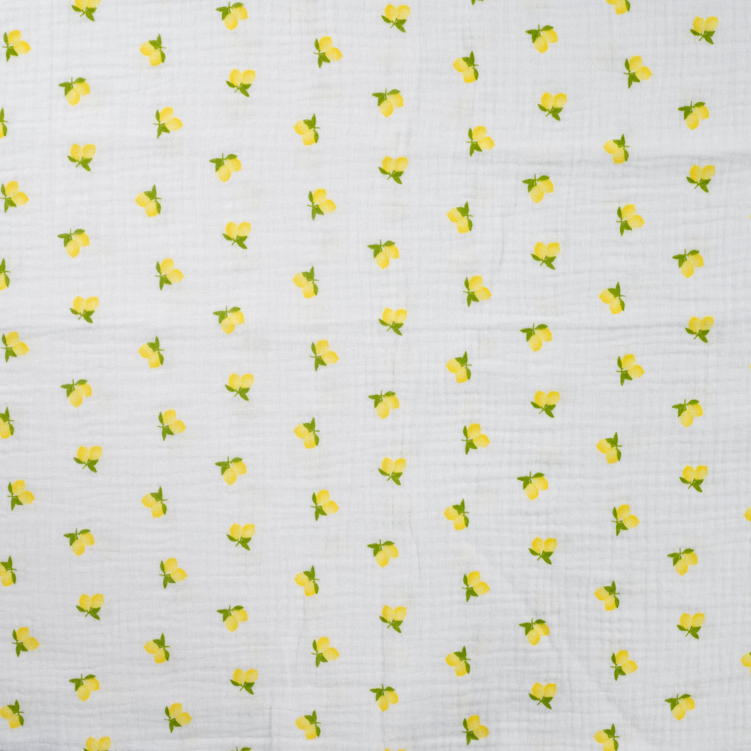 Süßer Musselin Stoff mit kleinen Zitronen auf altweißem Hintergrund.