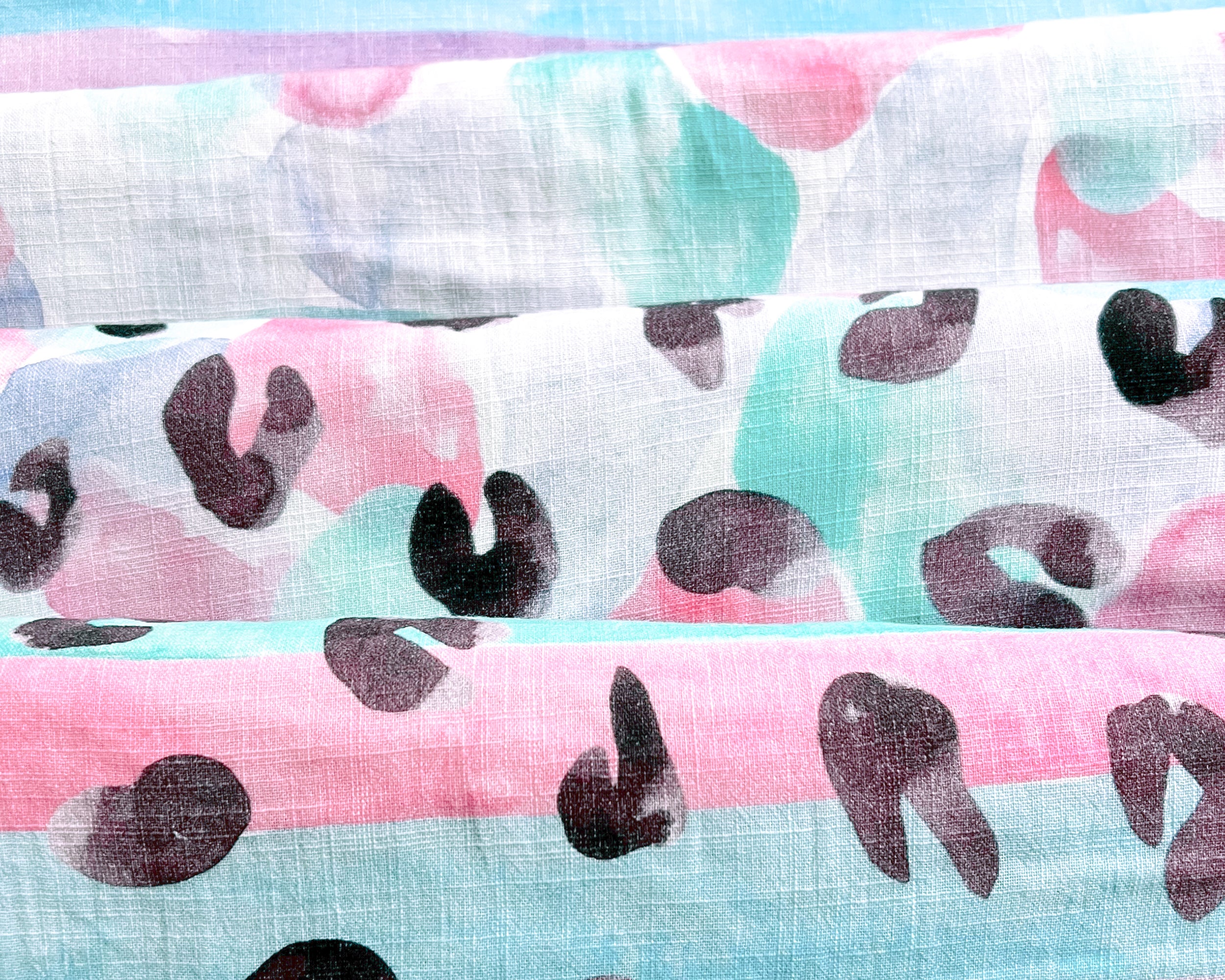 Die Leo-Flecken sind in einer soften Watercolor-Optik gestaltet und wirken wie gemalt statt grafisch klar abgegrenzt. Dadurch entsteht ein lebendiges, aber dennoch ruhiges Muster mit viel Tiefe. Je nach Variante treffen die Leo-Motive auf farbige Streifen oder auf flächige, aquarellartige Farbverläufe.