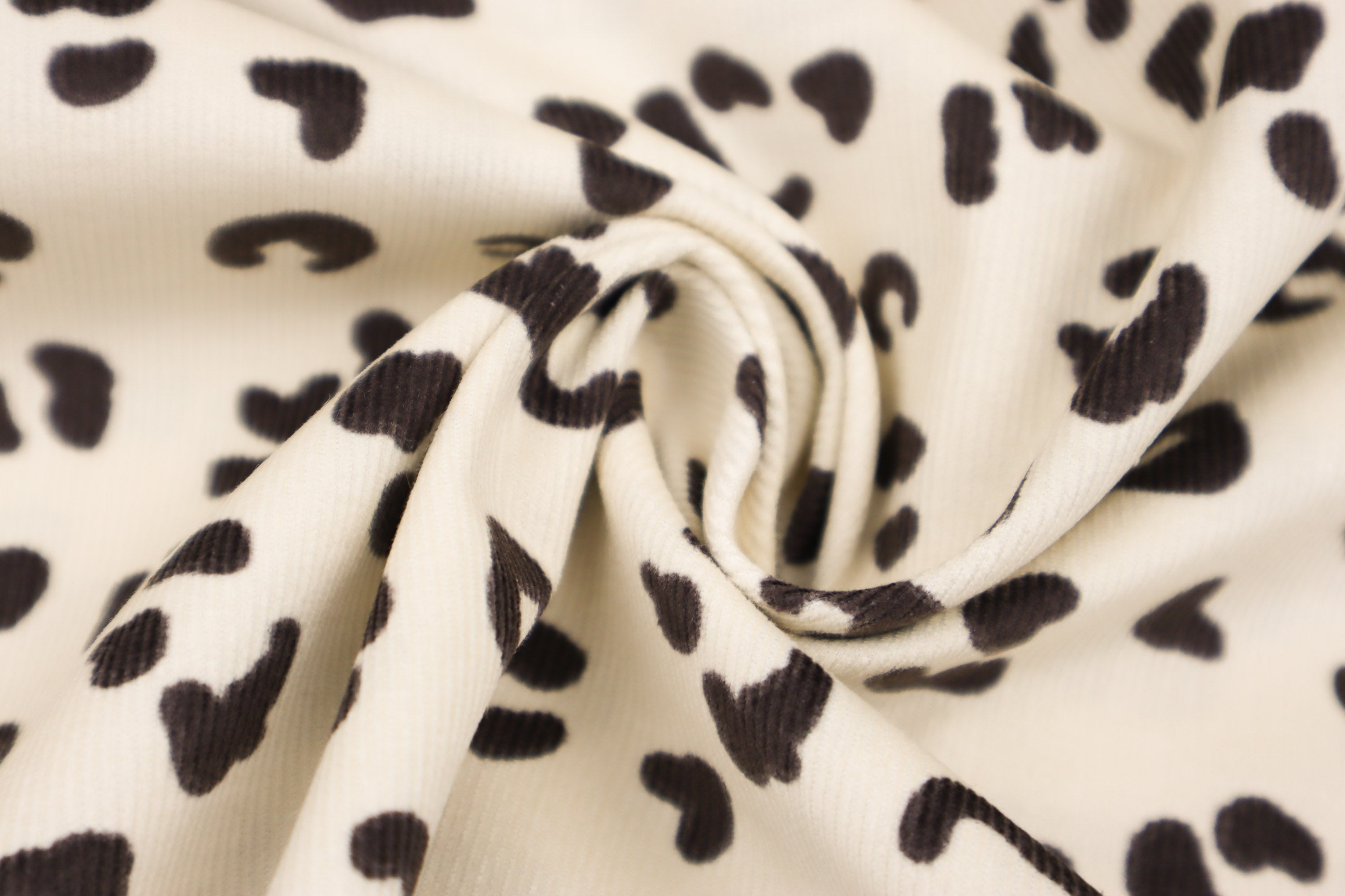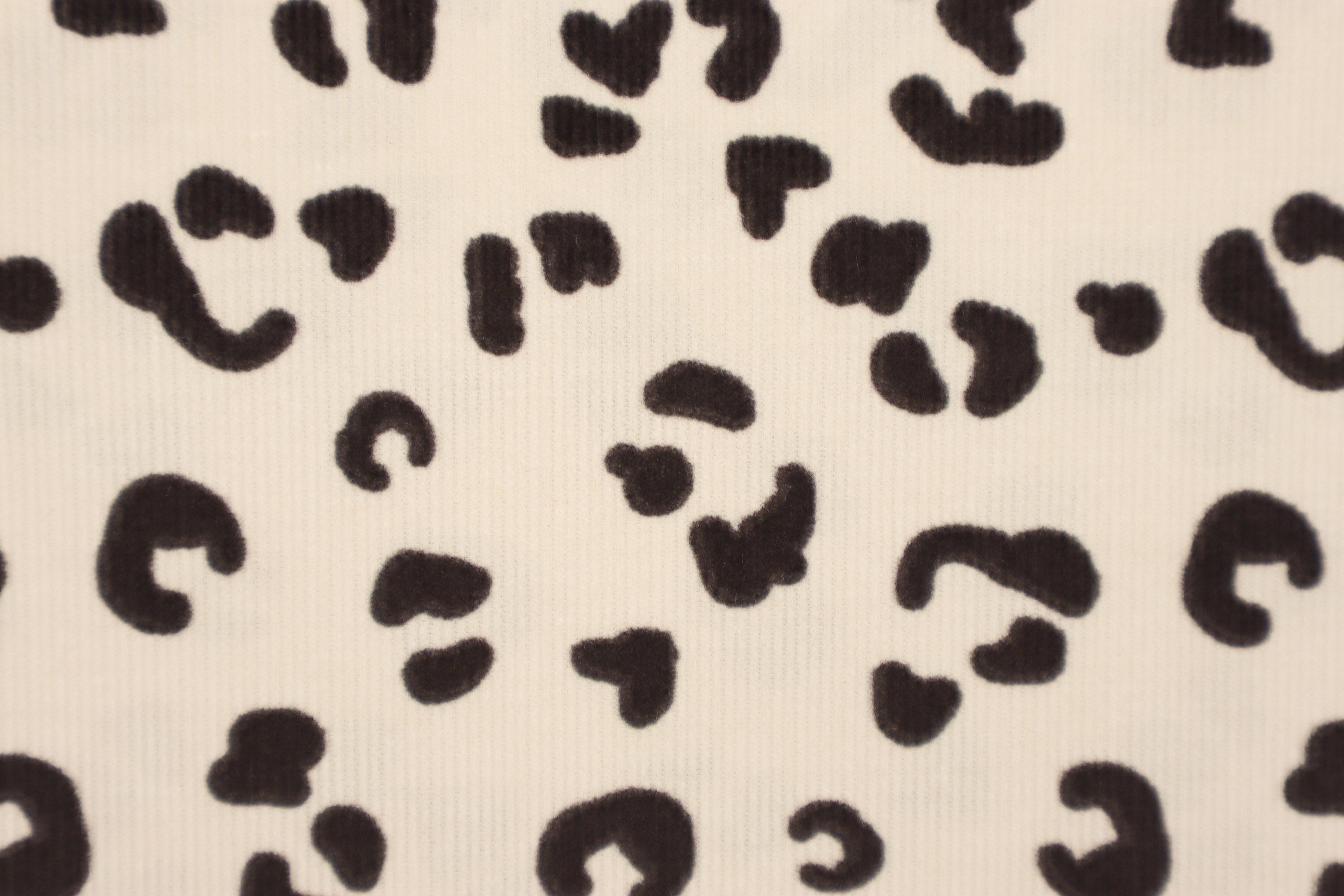Weicher Feincord aus 100% Baumwolle im angesagten Leoprint Design mit dunkelbraunen Tupfen auf beigem Grund. Langlebig und vielseitig einsetzbar.