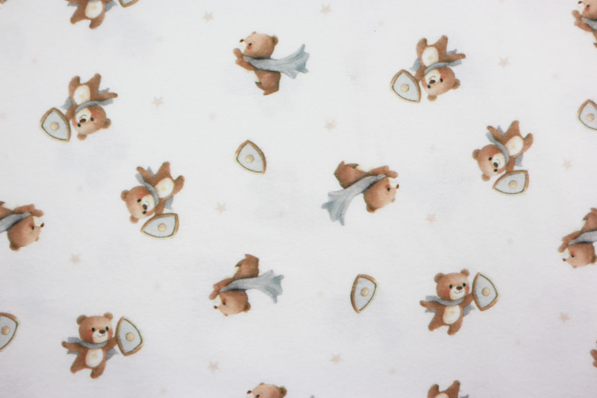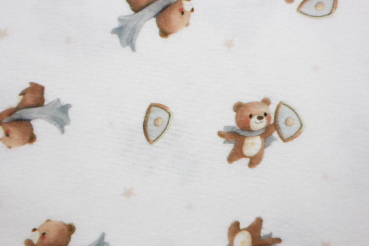 Niedliches Muster mit kleinen Superheld-Bären auf naturfarbenem Hintergrund.