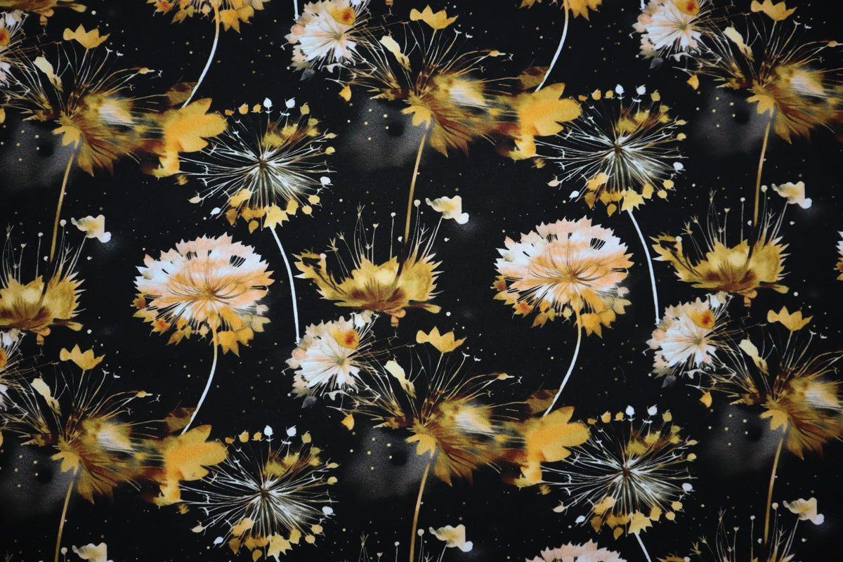 Schönes Muster mit senfgelben Pusteblumen auf schwarzem Hintergrund.