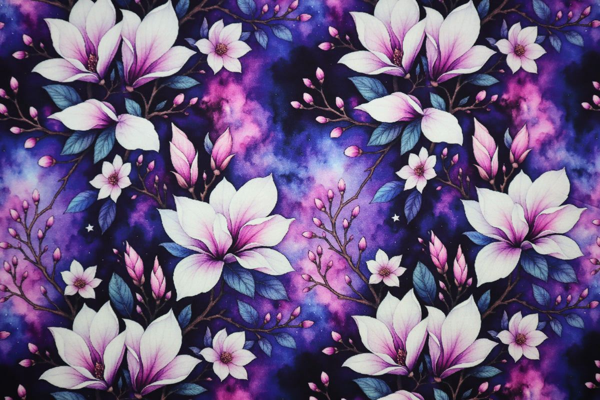 Schönes Blumenmuster mit Magnolien auf lila/flieder Hintergrund.