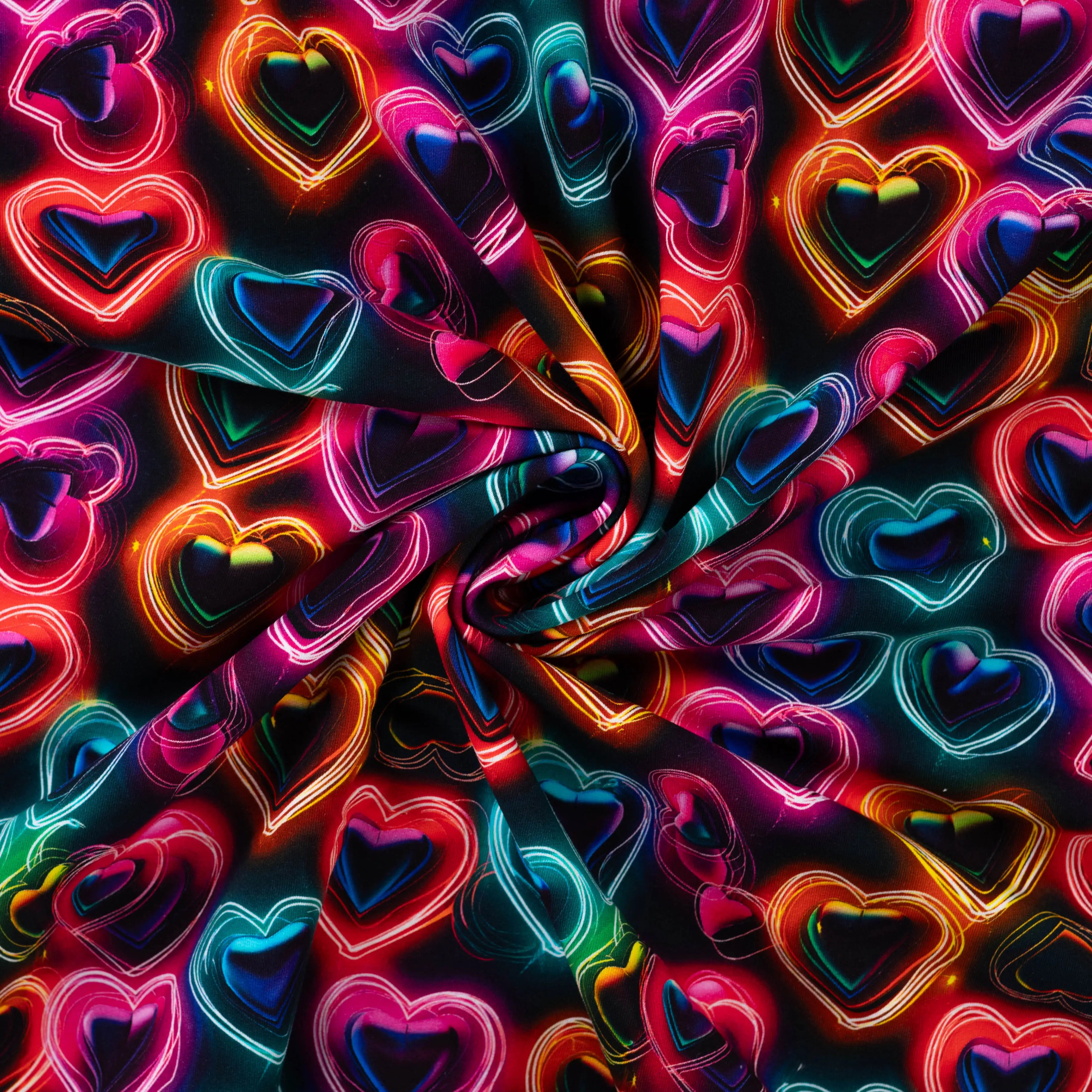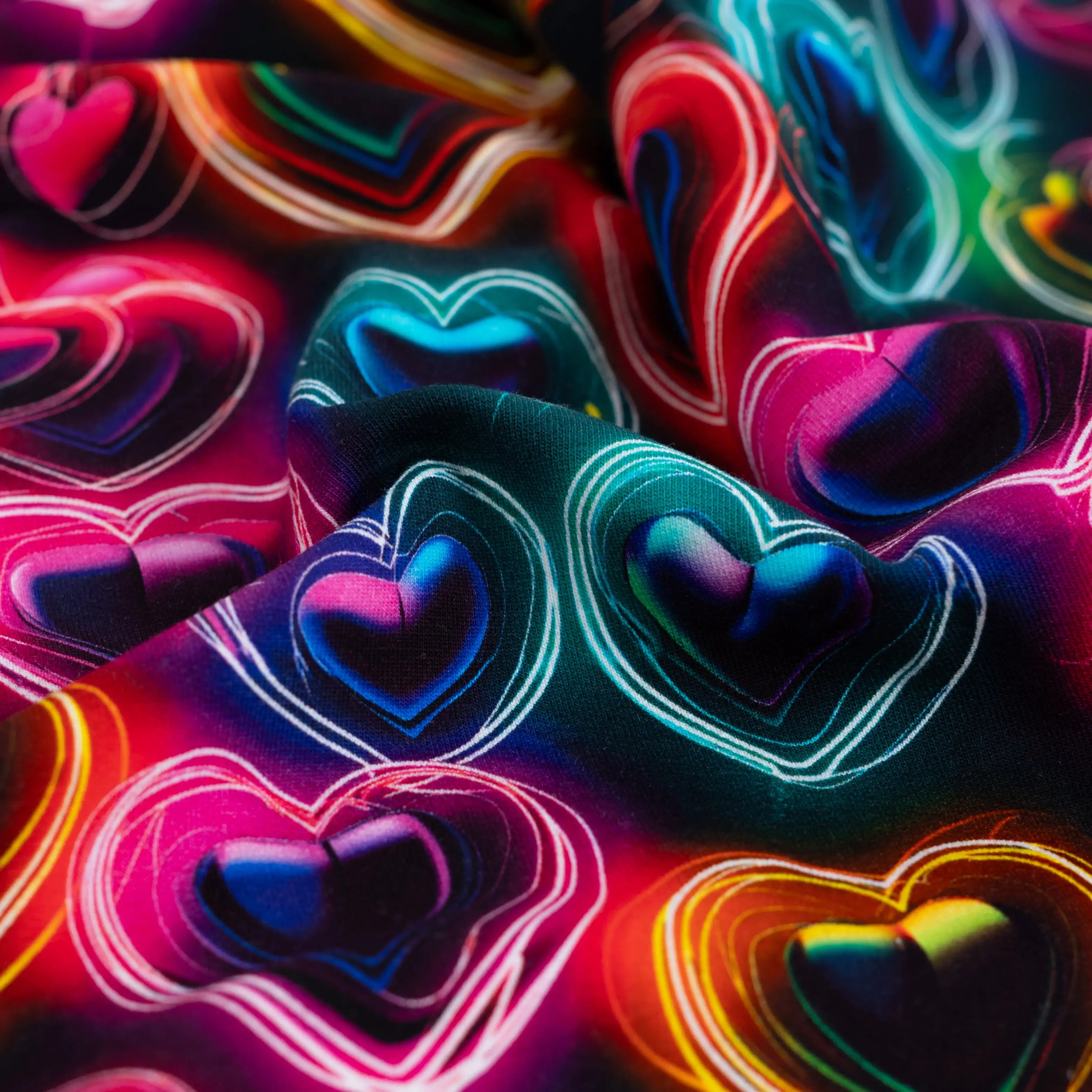 Cooles Muster mit scheinenden, bunten Herzen auf schwarzem Hintergrund.