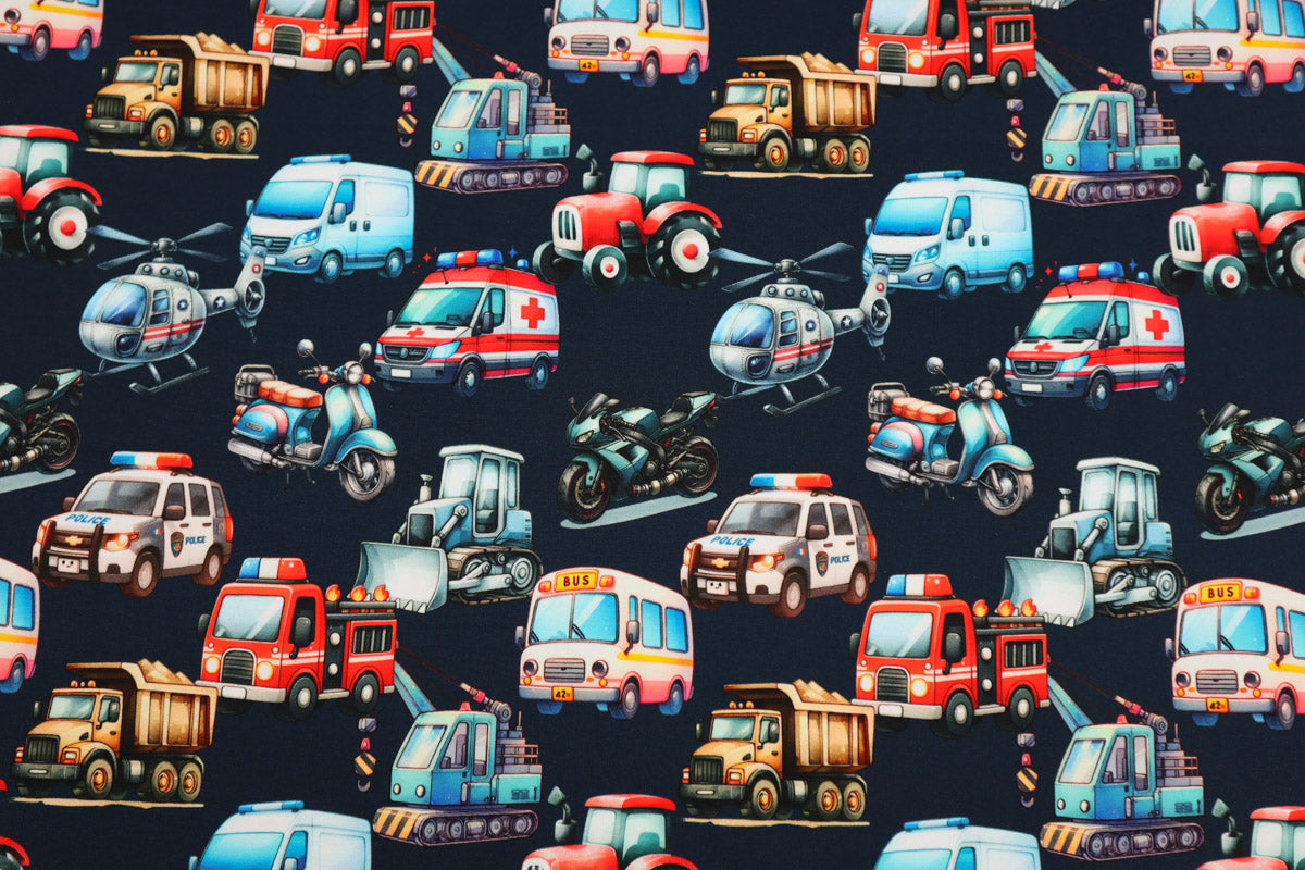 Tolles Design für Kinder mit kleinen und großen Fahrzeugen auf dunkelblauem Grund.