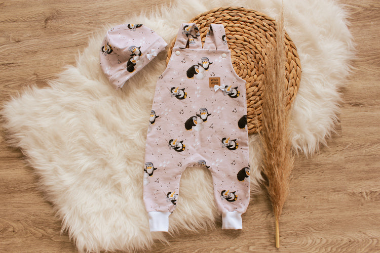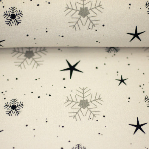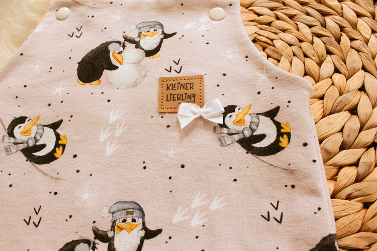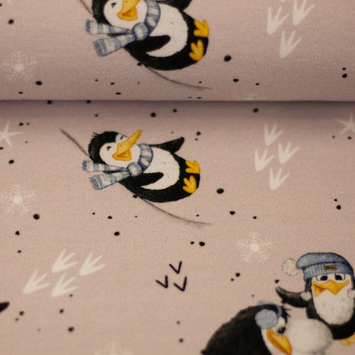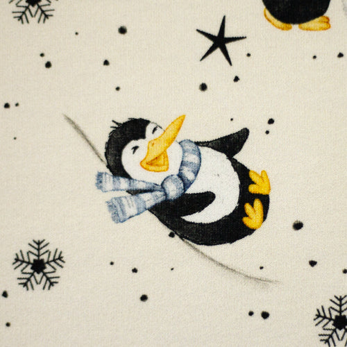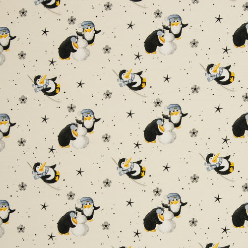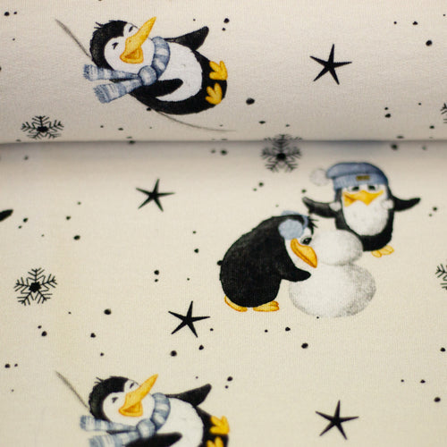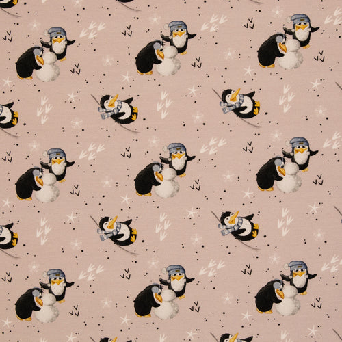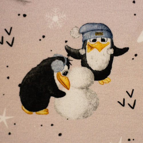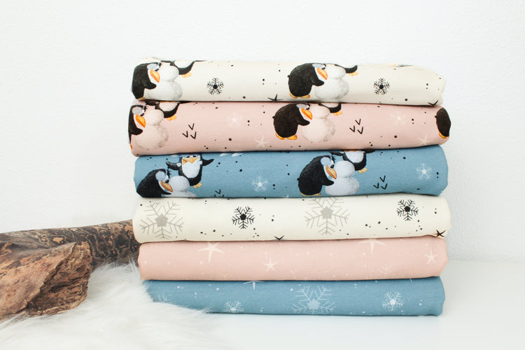 Es gibt zwei Designs in drei wunderschönen Farben: Zartes Rosa, Taubenblau und Natur. Die Pinguine bauen einen Schneemann und genießen das Schneetreiben. Der Kombistoff mit Eiskristallen, Sternen und Schneeflocken sieht auch alleine wunderschön aus!
