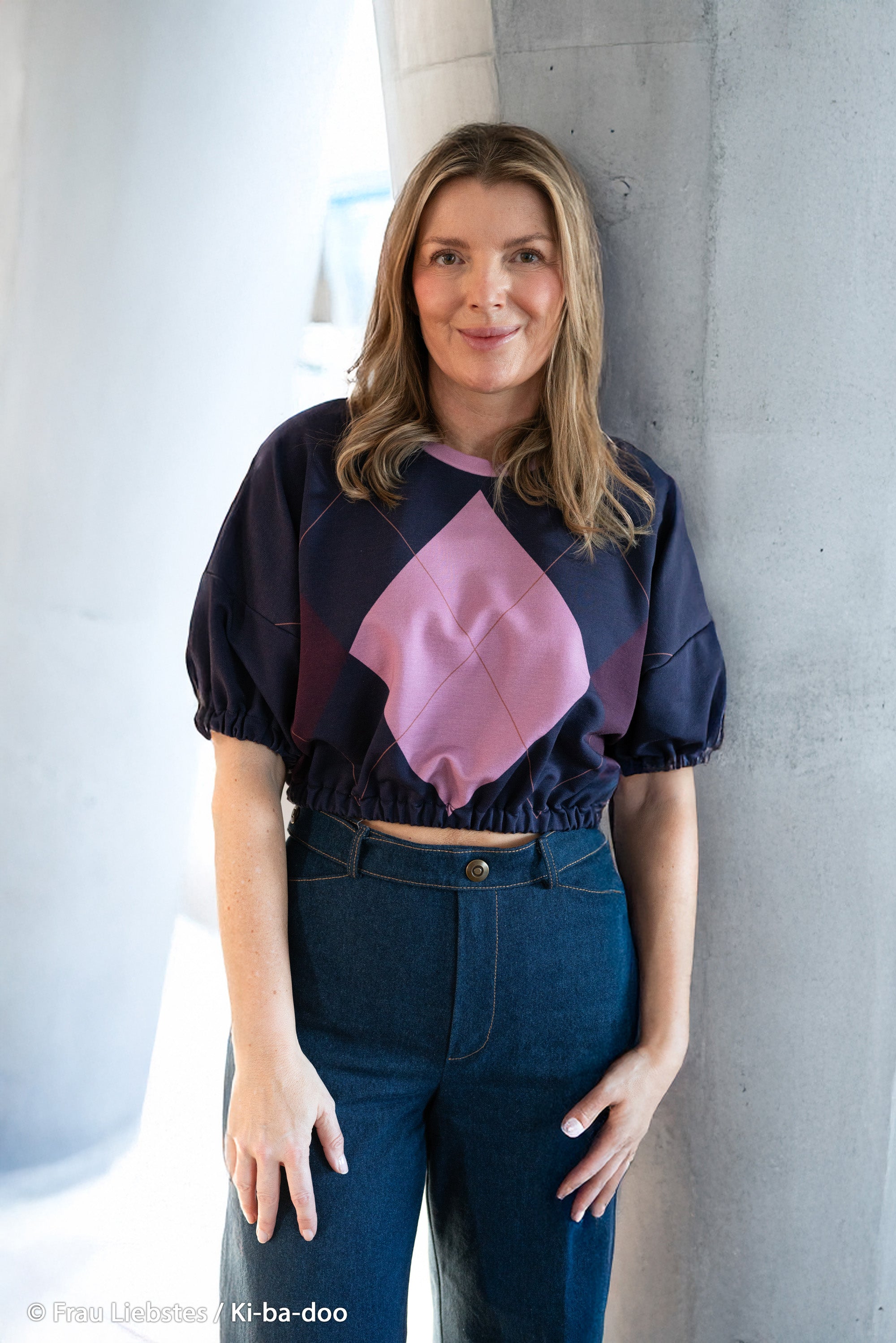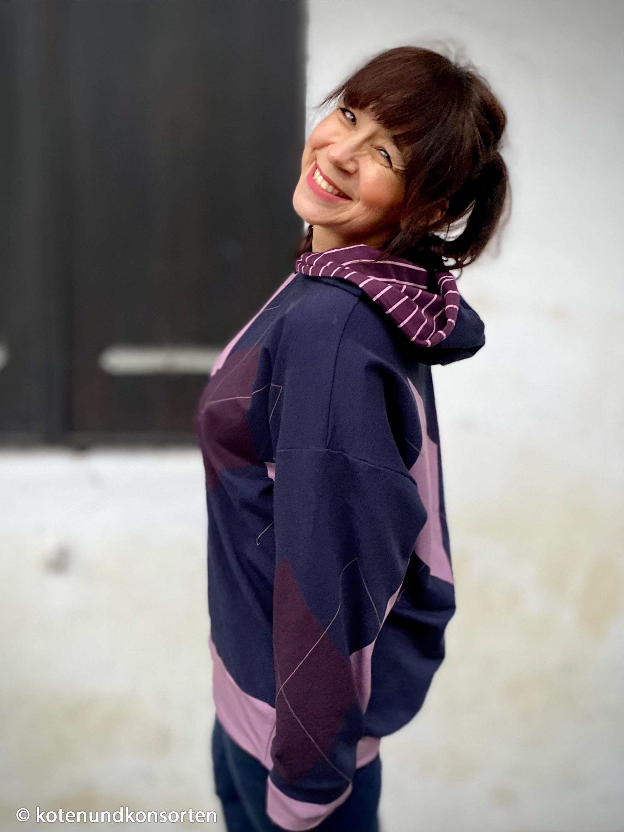 Das durchdachte Panel ist etwas ganz Besonderes: Das 1m hohe Panel hat den plakativen Rauten-Streifen mit dem Argyle-Muster und unten noch mal einen Abschluss in knalliger Farbe. Dieses Stück kann man wunderbar als Bündchen nehmen, aber auch für Rüschen am Sweater, als kurzer Ärmel oder als Streifeneinsatz im Ärmel – bei den Modellen gibt es so coole Ideen!