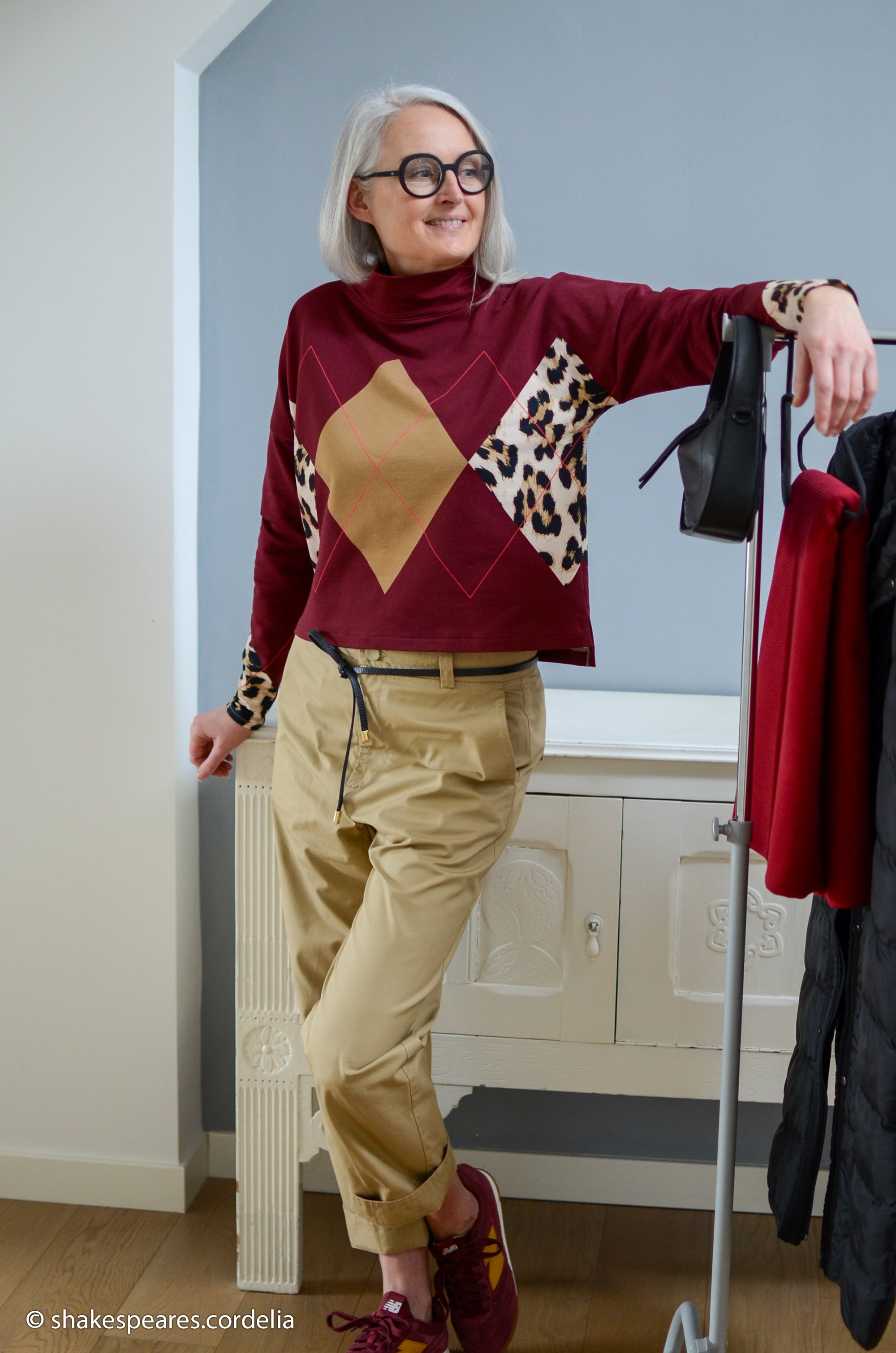 Das durchdachte Panel ist etwas ganz Besonderes: Das 1m hohe Panel hat den plakativen Rauten-Streifen mit dem Argyle-Muster und unten noch mal einen Abschluss in knalliger Farbe. Dieses Stück kann man wunderbar als Bündchen nehmen, aber auch für Rüschen am Sweater, als kurzer Ärmel oder als Streifeneinsatz im Ärmel – bei den Modellen gibt es so coole Ideen!