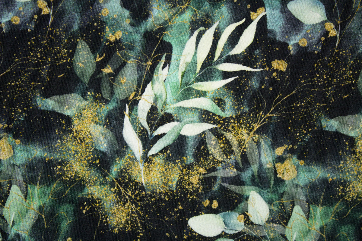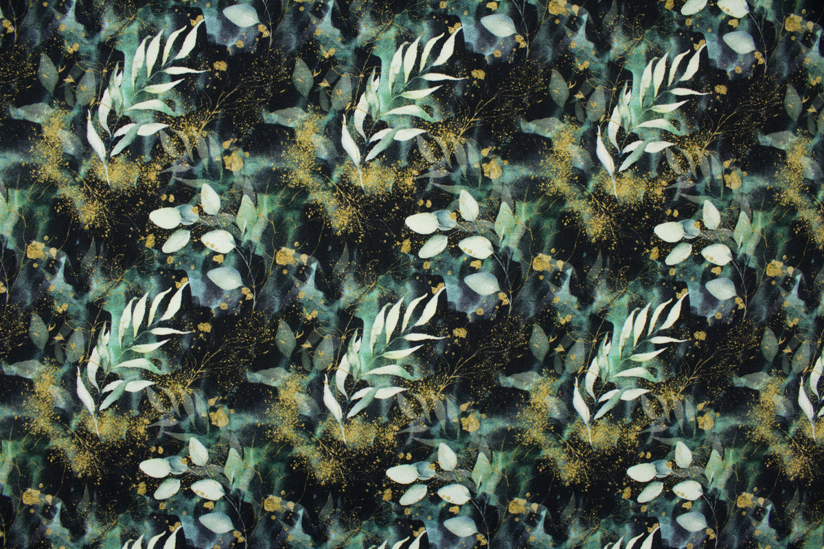 Elegantes Muster mit Eukalyptus und golden wirkenden Akzenten auf schwarzem Hintergrund.