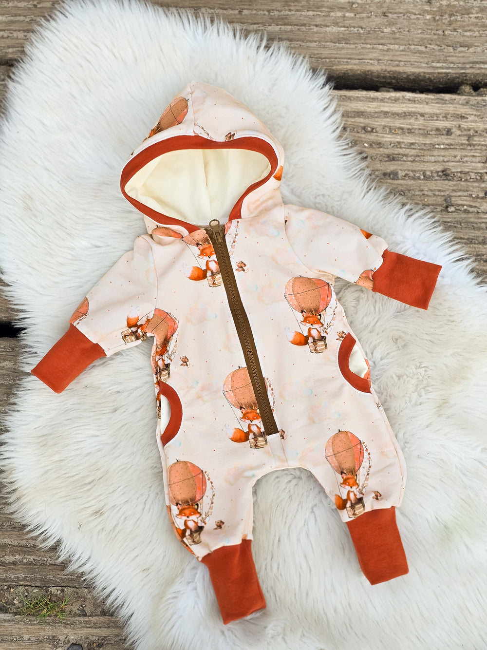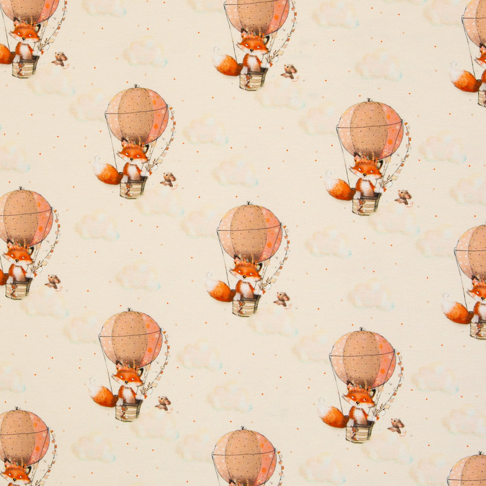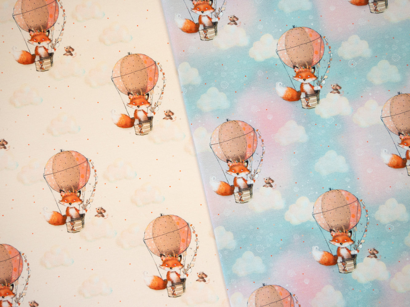 Der niedliche kleine Fuchs im Heißluftballon vor sanften Wolken in Pastelltönen.