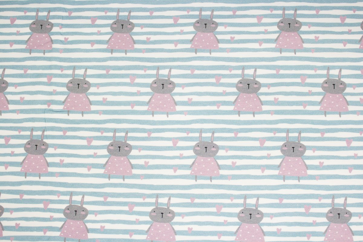 Niedliches Muster mit kleinen Häschen und Herzen auf gestreiftem Hintergrund.