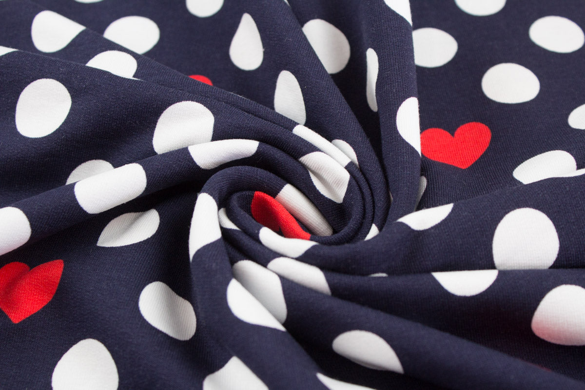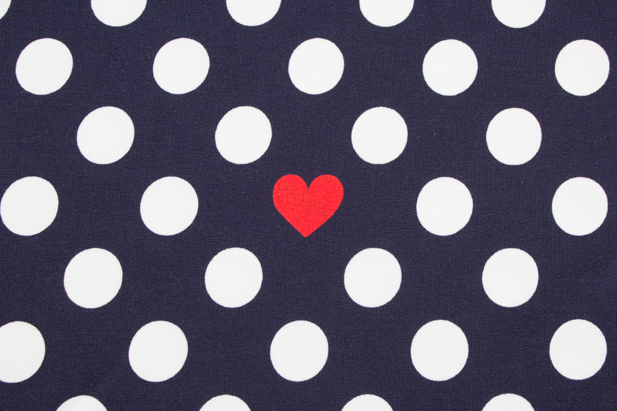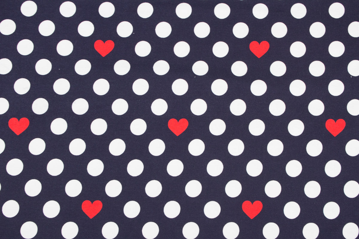 Schönes Muster mit weißen Dots und roten Herzen. Die Punkte haben einen Durchmesser von ca 2 cm.
