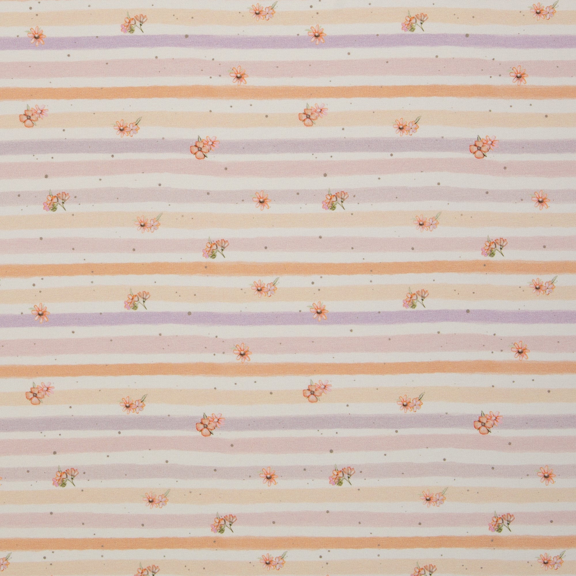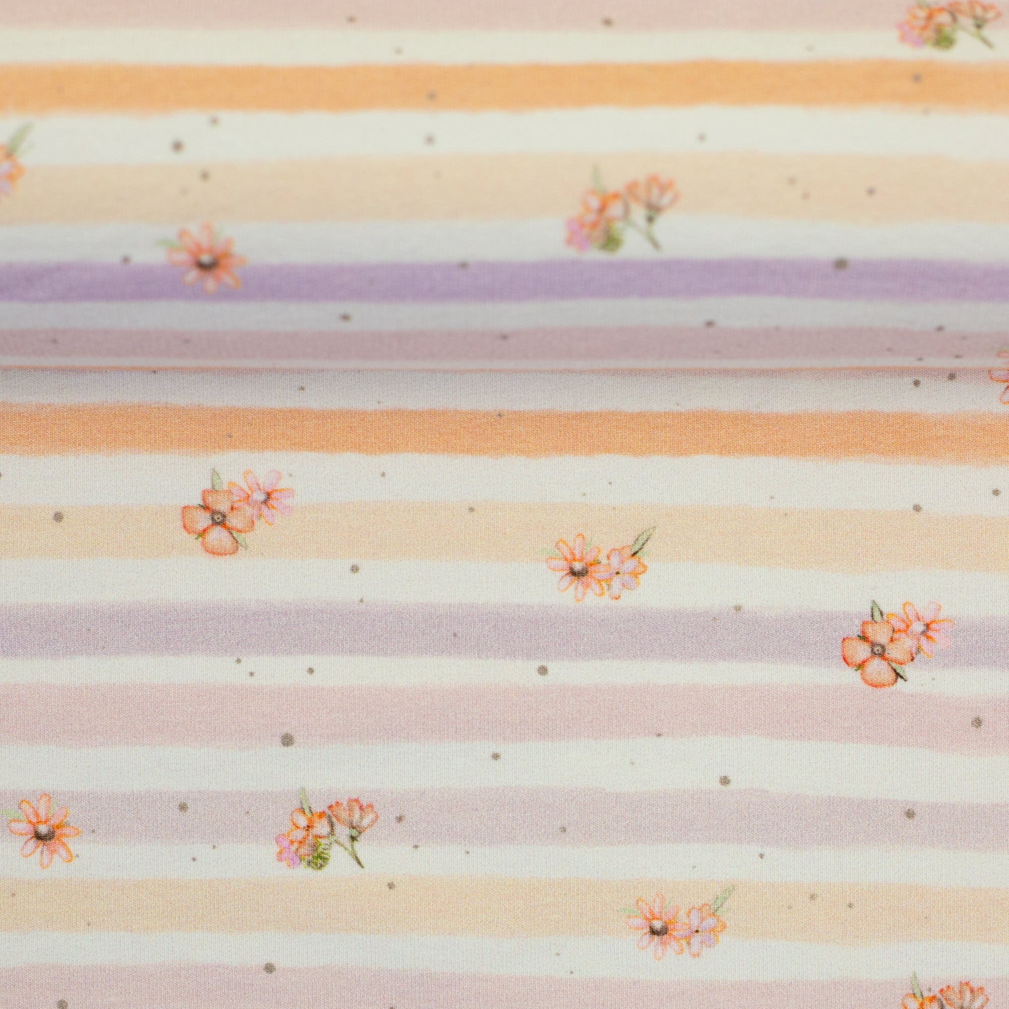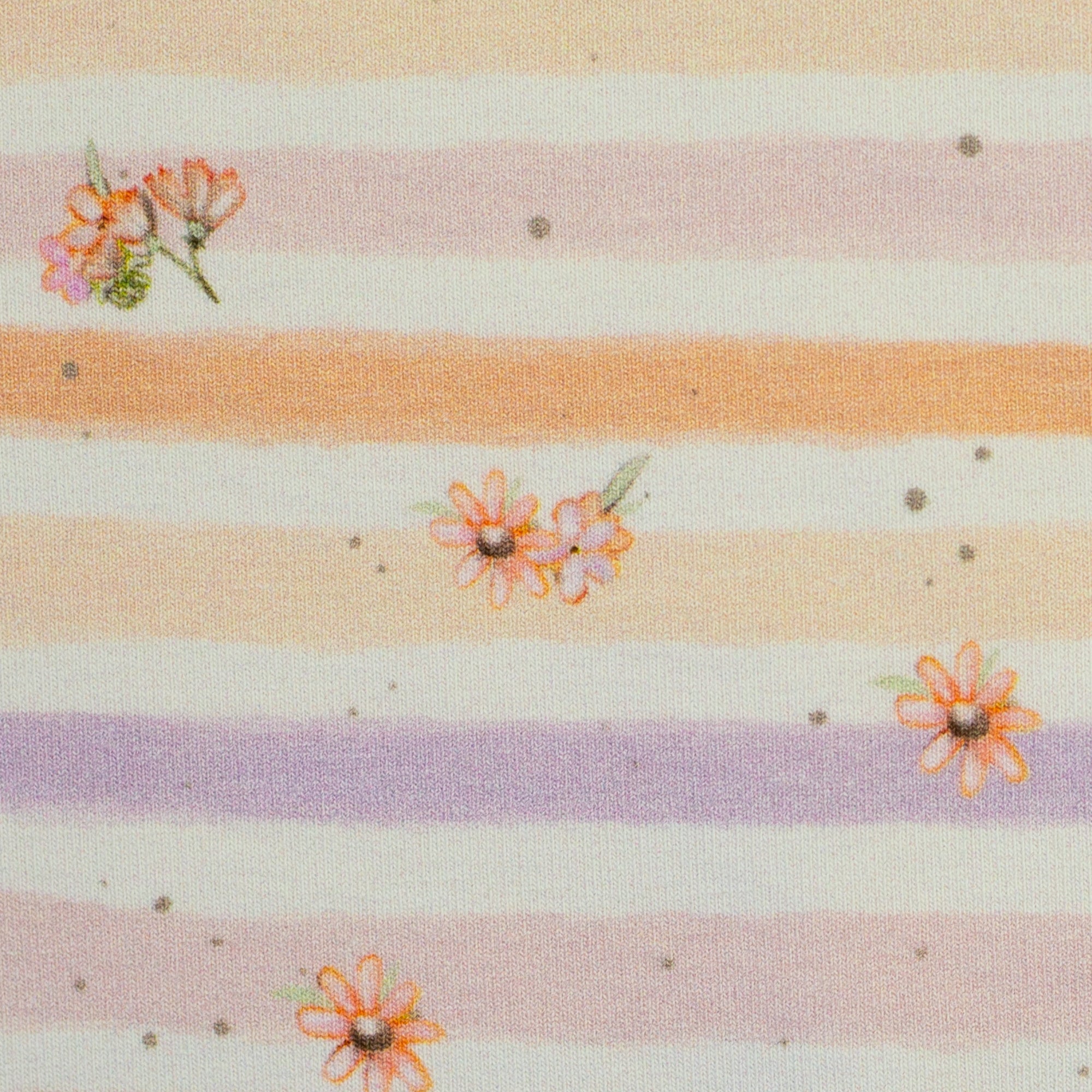 Die Motive sind locker verteilt und wirken freundlich und ruhig – perfekt für kindgerechte Kleidung mit viel Charme. Ergänzt wird das Design durch ein feines Streifenmotiv mit kleinen floralen Akzenten, das bewusst zurückhaltend gestaltet ist und sich auch einzeln sehr schön einsetzen lässt. Ideal als Kombistoff für Ärmel, Rückenteile oder Details, aber auch für schlichte, ruhige Schnitte.