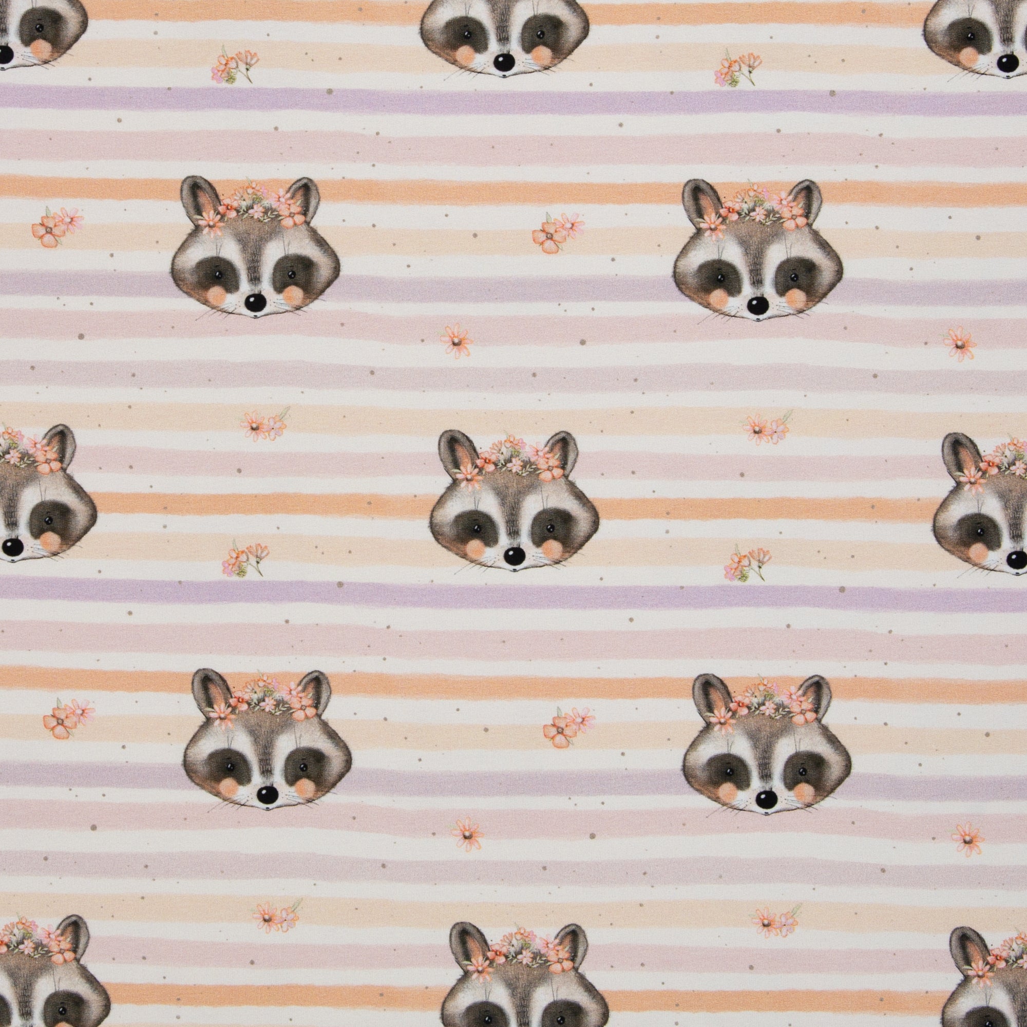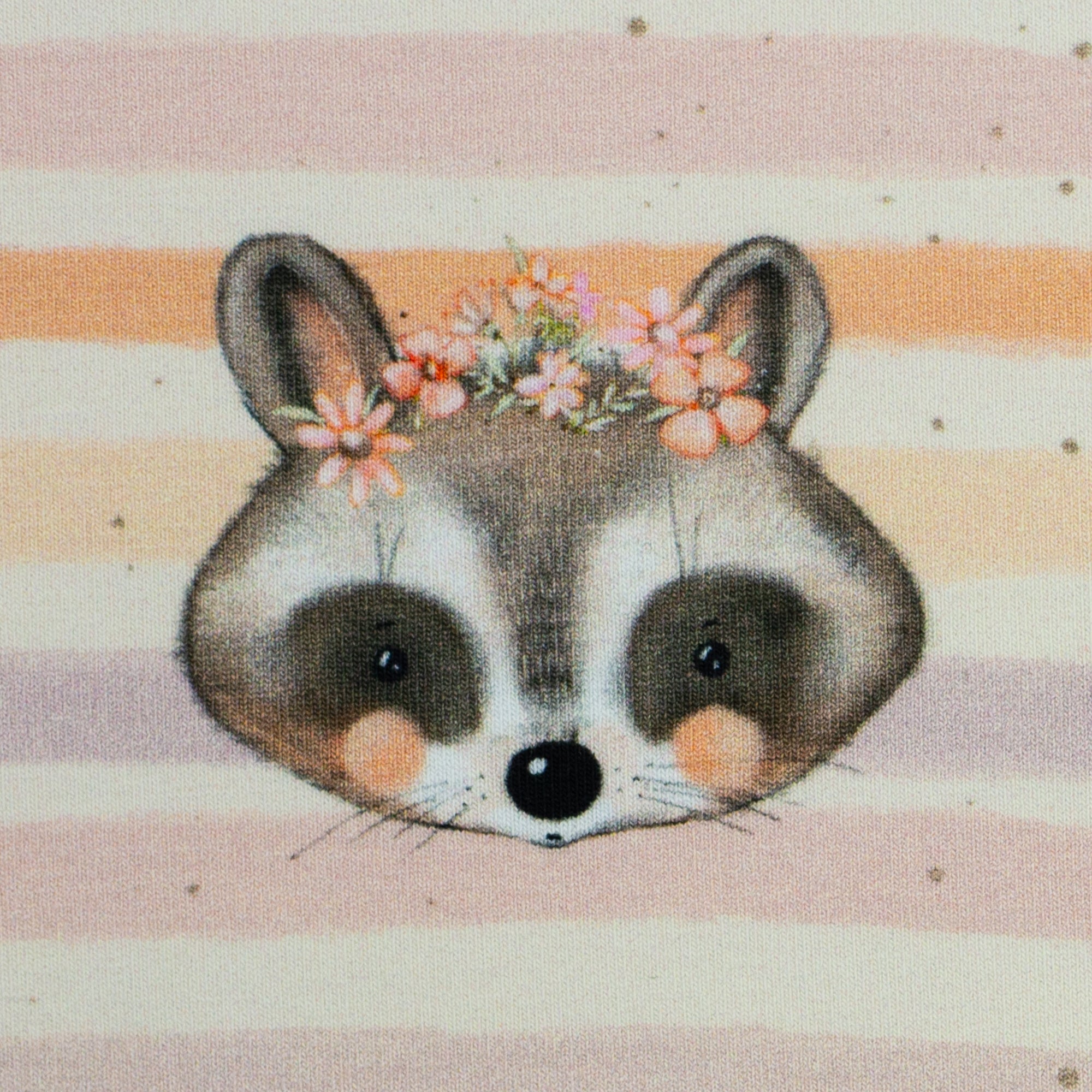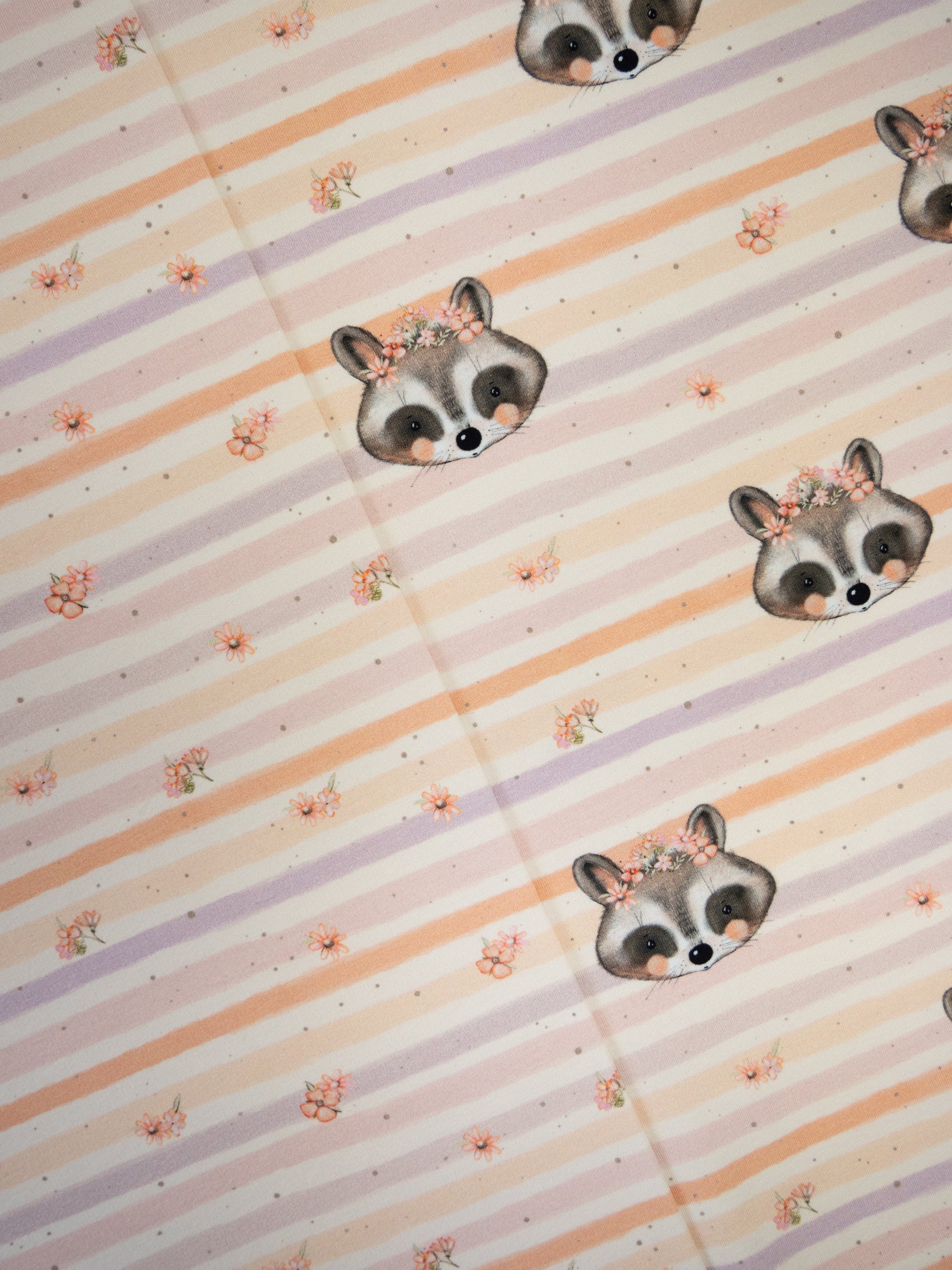 Monty ist ein besonders liebevoll gestalteter French Terry mit zwei harmonisch aufeinander abgestimmten Designs. Im Mittelpunkt steht ein verspieltes Allover-Motiv mit niedlichen Waschbärgesichtern, kleinen Blümchen und weich verlaufenden, leicht unregelmäßigen Streifen mit aquarellartigem Charakter.