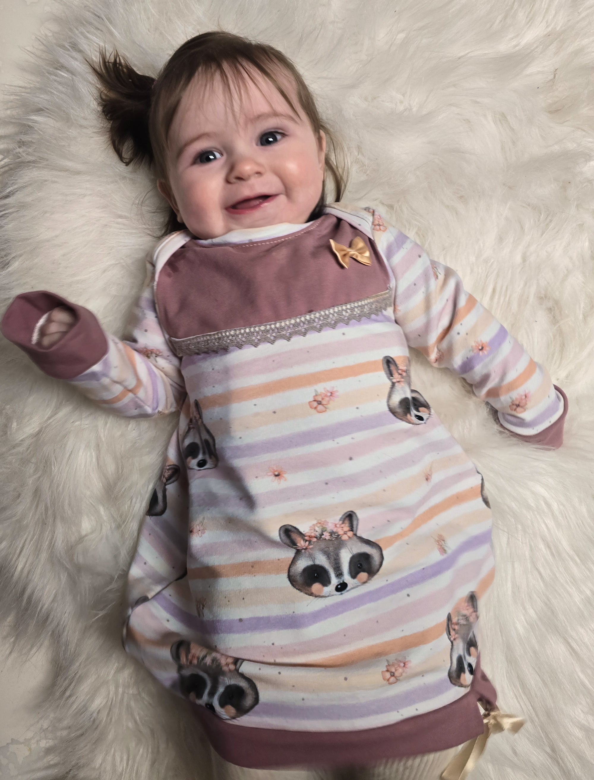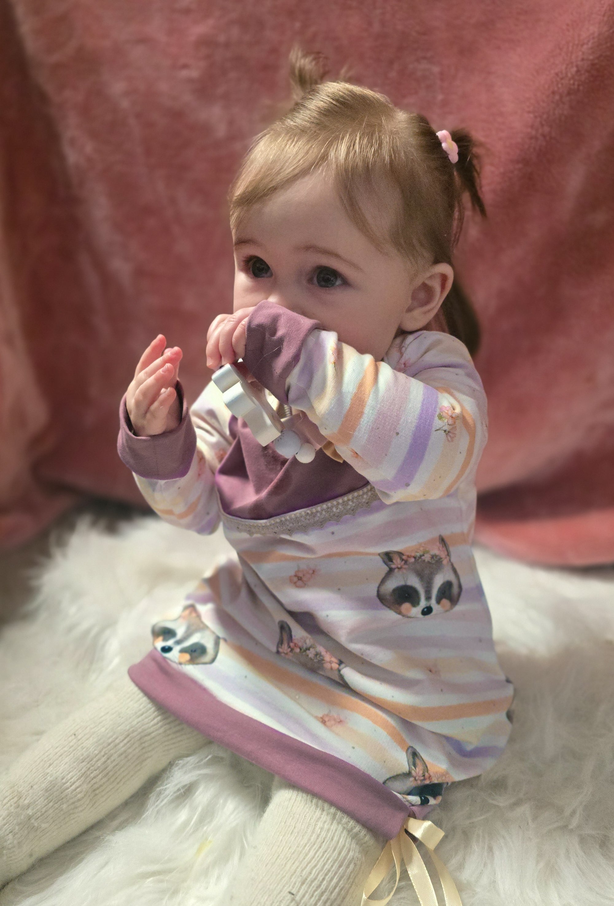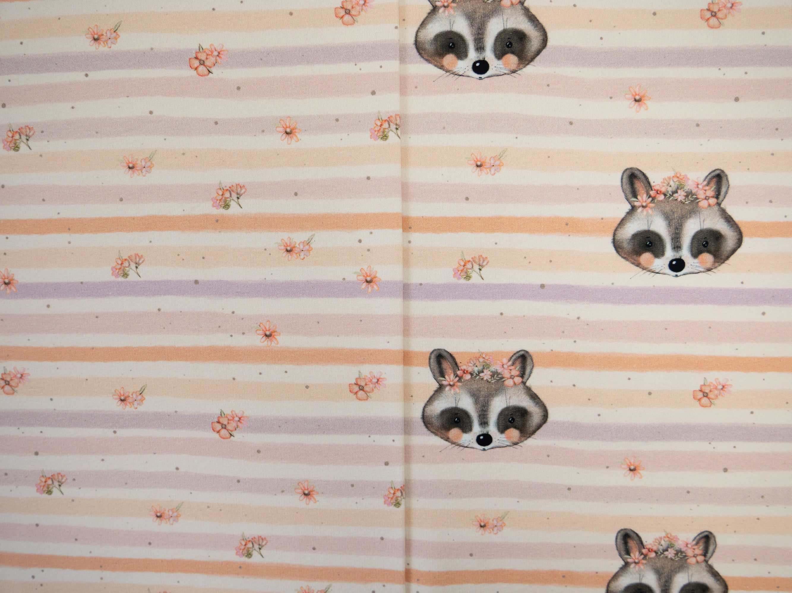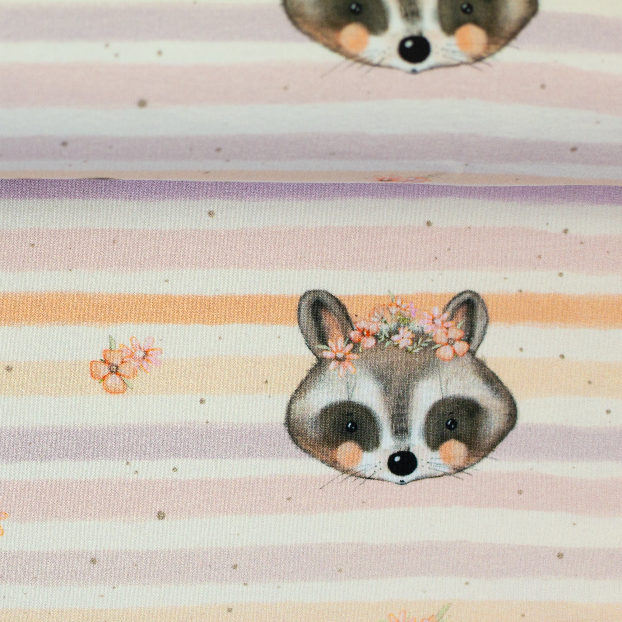 Monty ist ein besonders liebevoll gestalteter French Terry mit zwei harmonisch aufeinander abgestimmten Designs. Im Mittelpunkt steht ein verspieltes Allover-Motiv mit niedlichen Waschbärgesichtern, kleinen Blümchen und weich verlaufenden, leicht unregelmäßigen Streifen mit aquarellartigem Charakter.