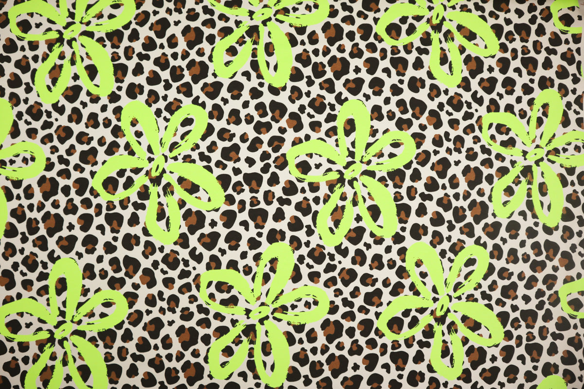 Toller French Terry mit großen neonfarbenen Blumen auf Leo-Hintergrund.