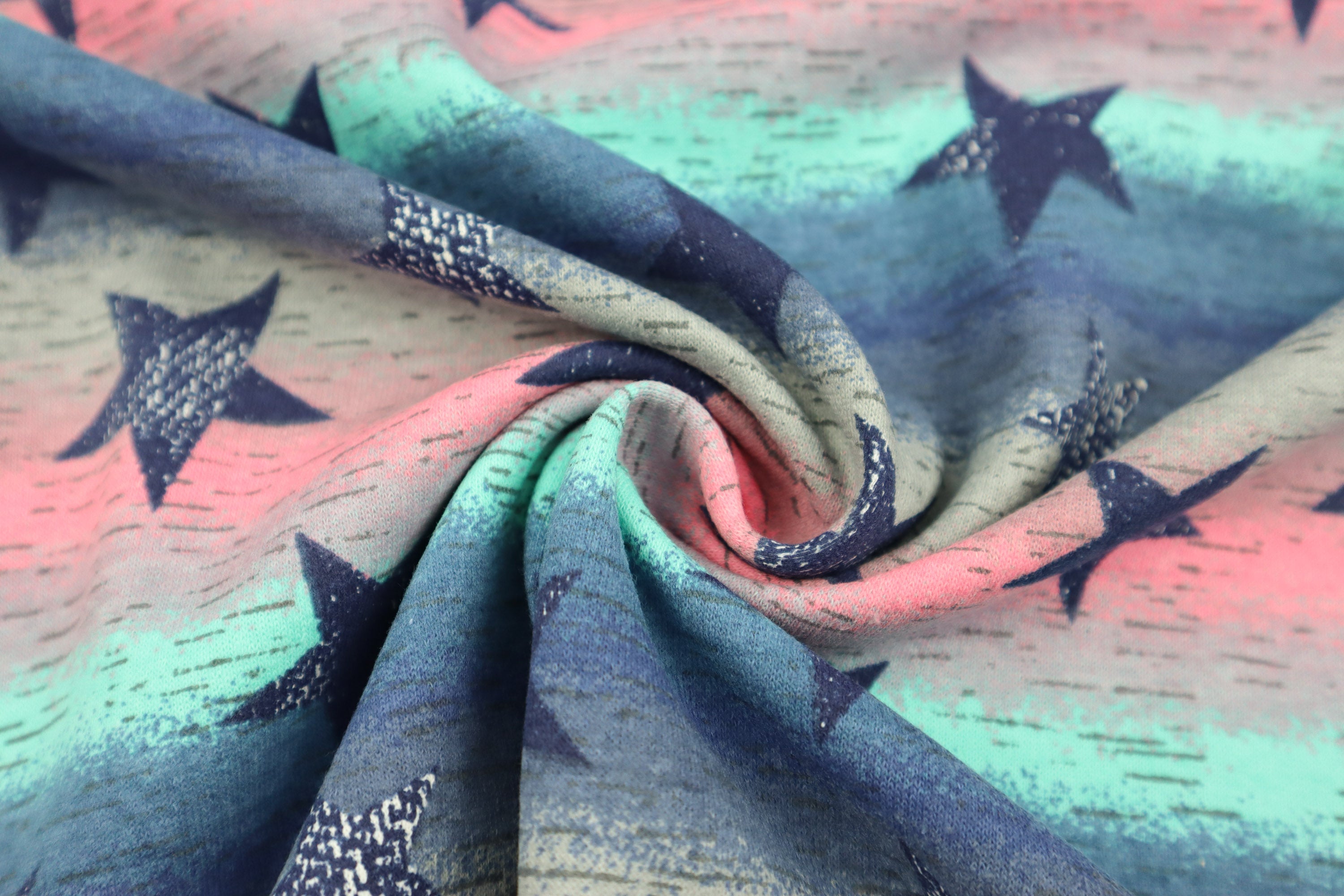 Super schöner French Terry mit Sternendruck in Jeansoptik auf pastellfarbenen Streifen.