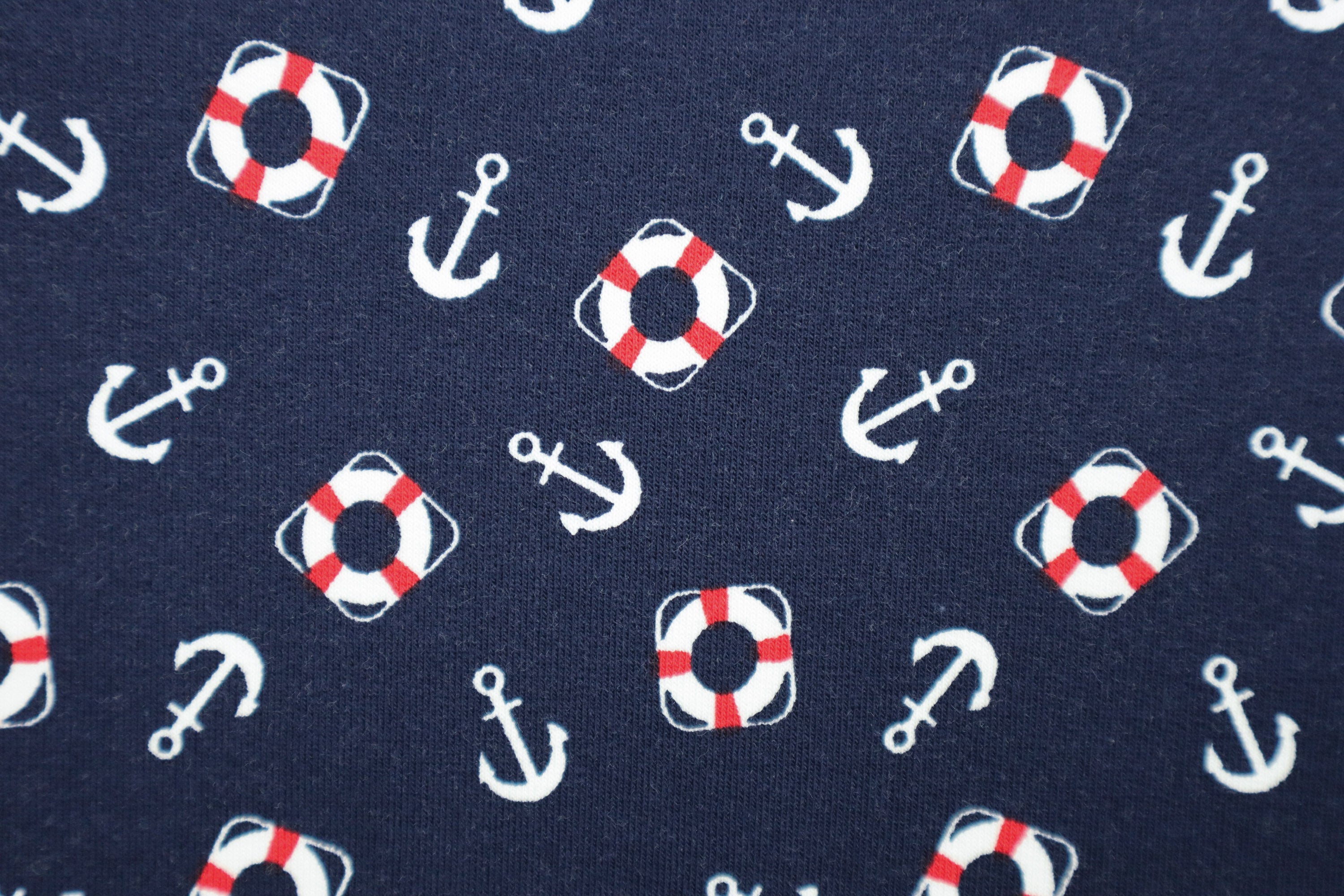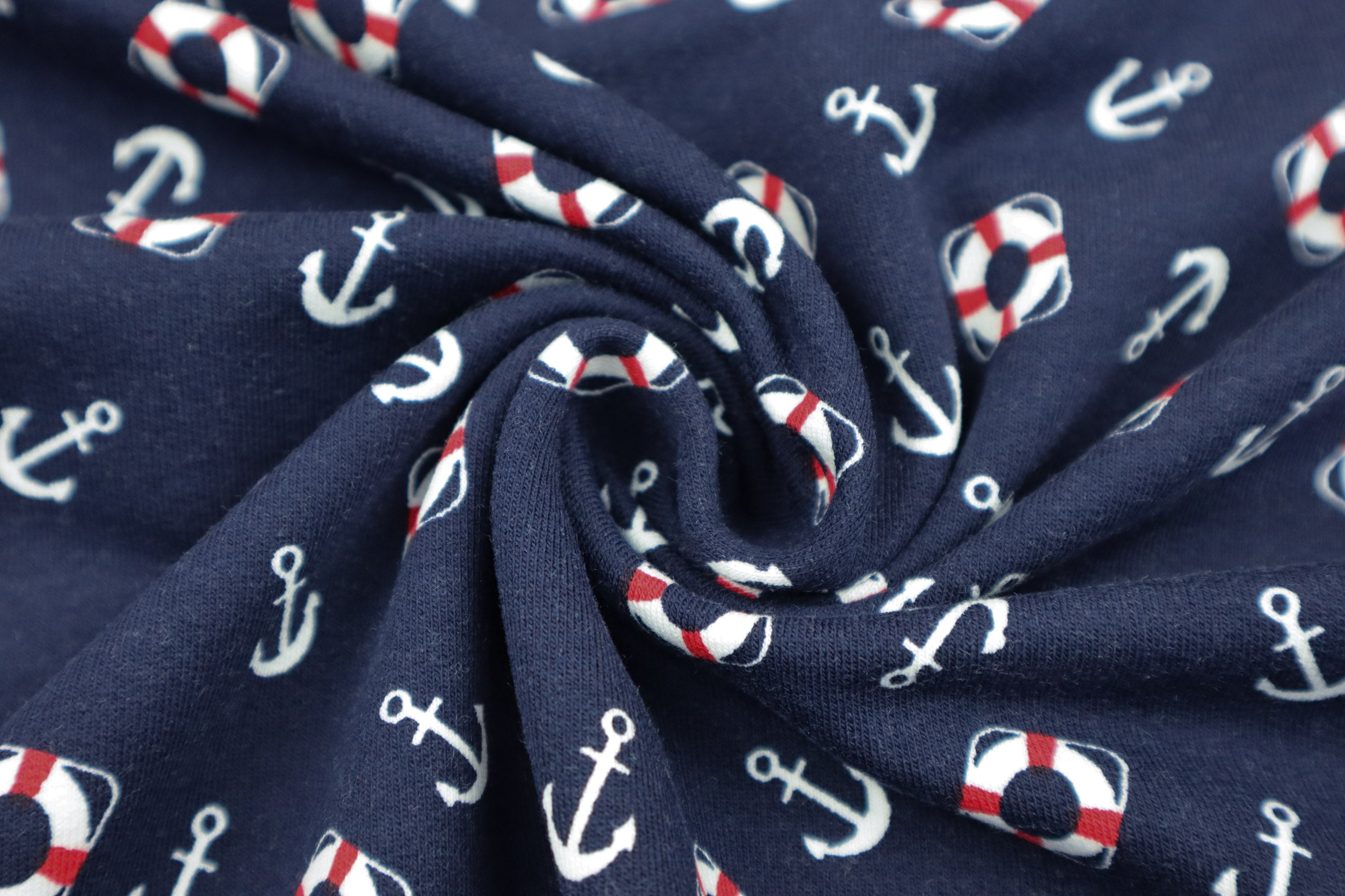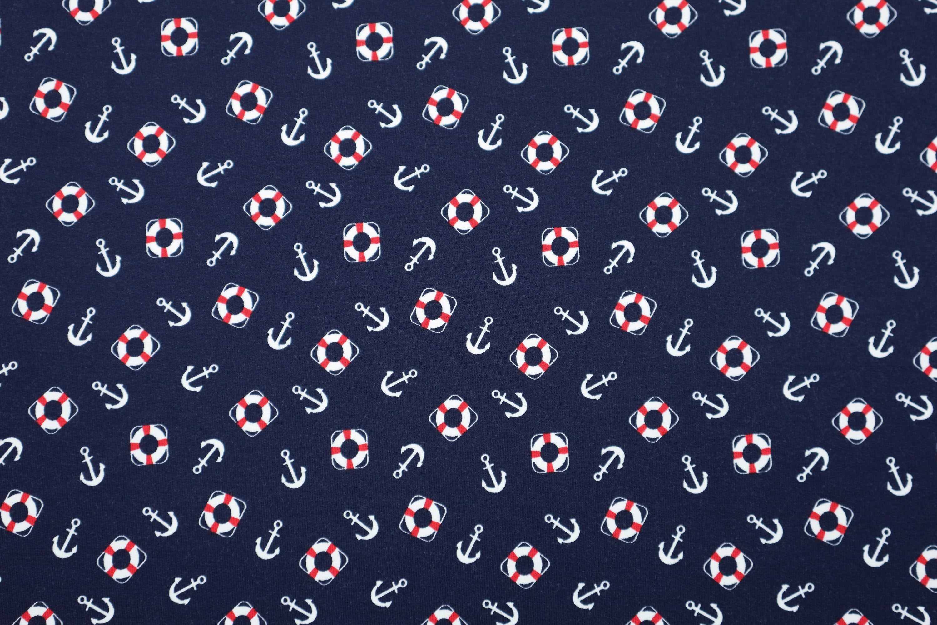 Maritimer French Terry von Hemmers Itex mit kleinen Ankern und Rettungsringen auf dunkelblauem Grund.