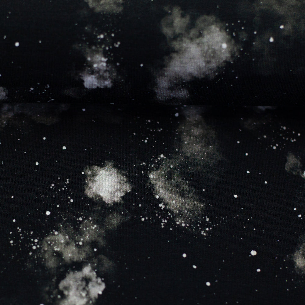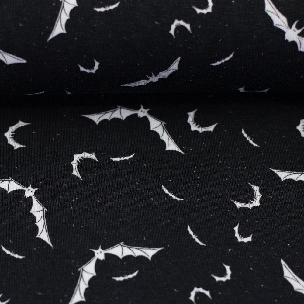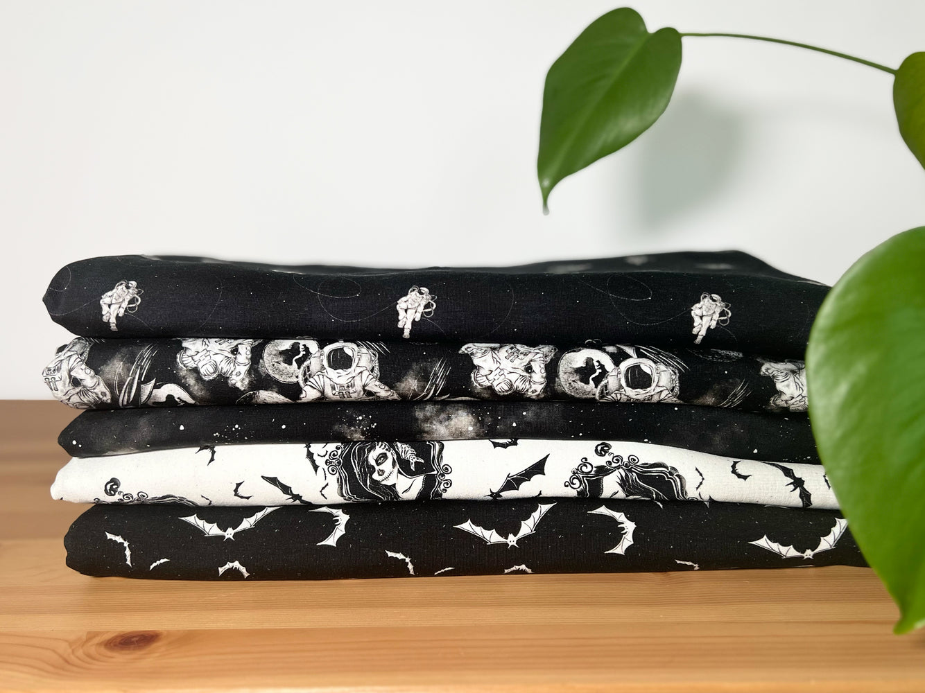 Die Stallaris French Terry Kollektion umfasst zwei Halloween-Motive und drei Weltraumdesigns - wobei das schwarze Universum auch wunderbar zu dem Stoff mit den Fledermäusen passt. Überhaupt sind alle Stoffe wunderbar kombinierbar.