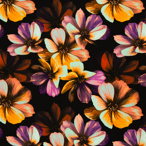 Die traumhaften Blumen gibt es in Blau-Petrol-Tönen und etwas gedeckter in Lila-Senf-Brauntönen – beide kommen auf dem dunklen Hintergrund so gut zur Geltung.