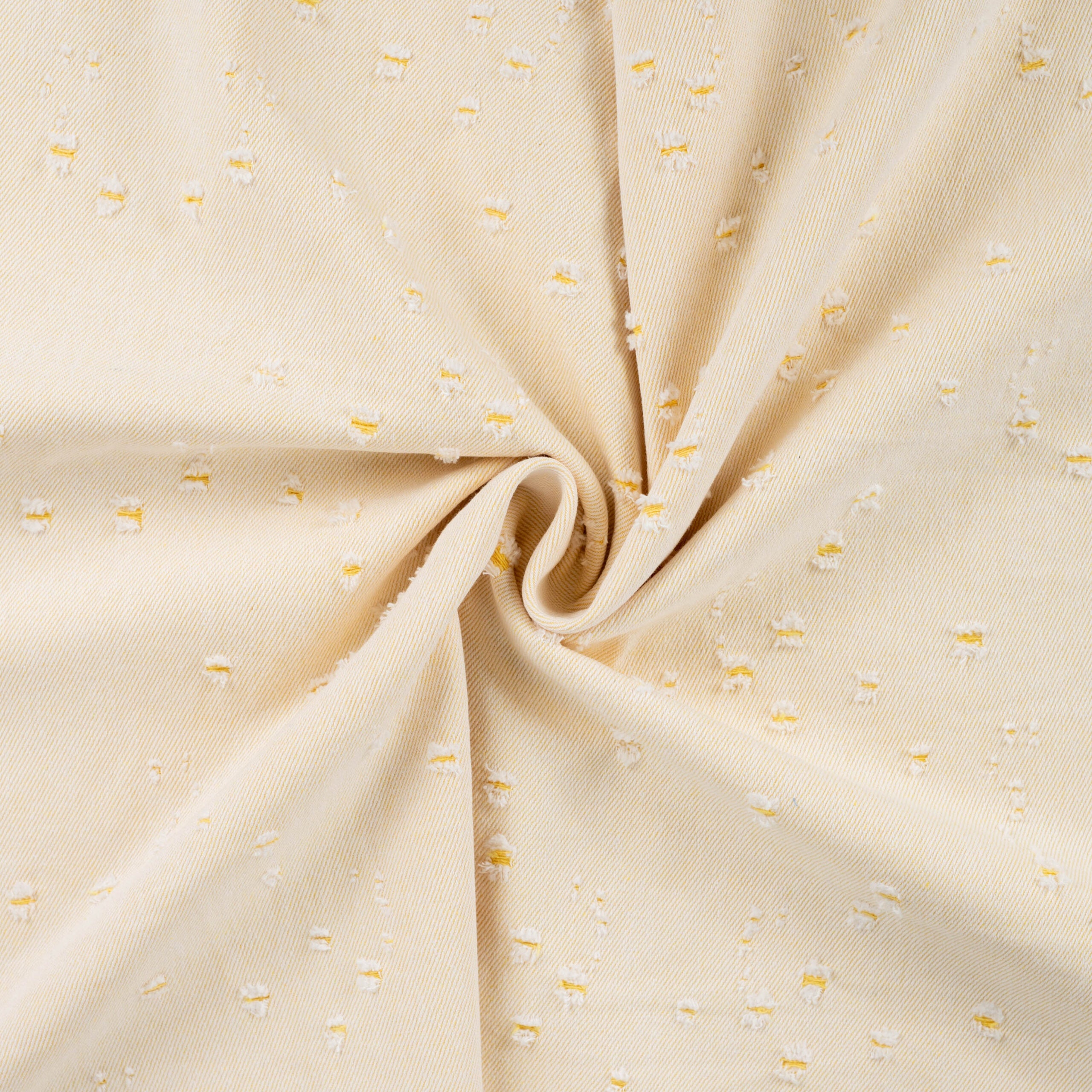 Cooler Jeansstoff in sommerlichem Gelb mit coolen Löchern im Used-Look.