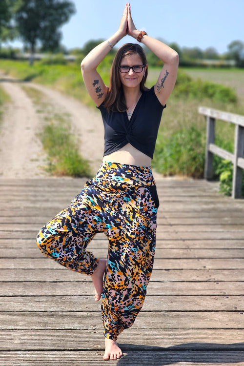Wunderschöne Blumen- und Leomuster in knallig bunten Farben.