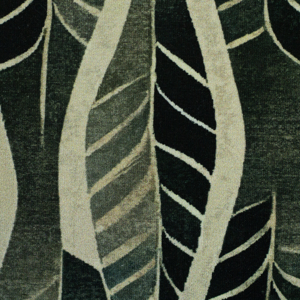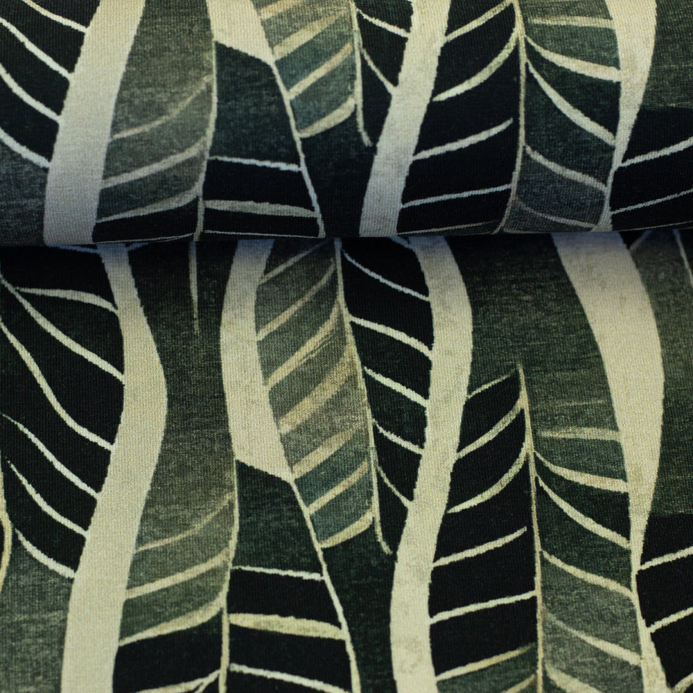 Blätter-Design: Auf Schilf-Khaki mit Schwarz – lässig, herbstlich und perfekt für Statement-Pieces wie lange Cardigans oder Oversize-Sweater.