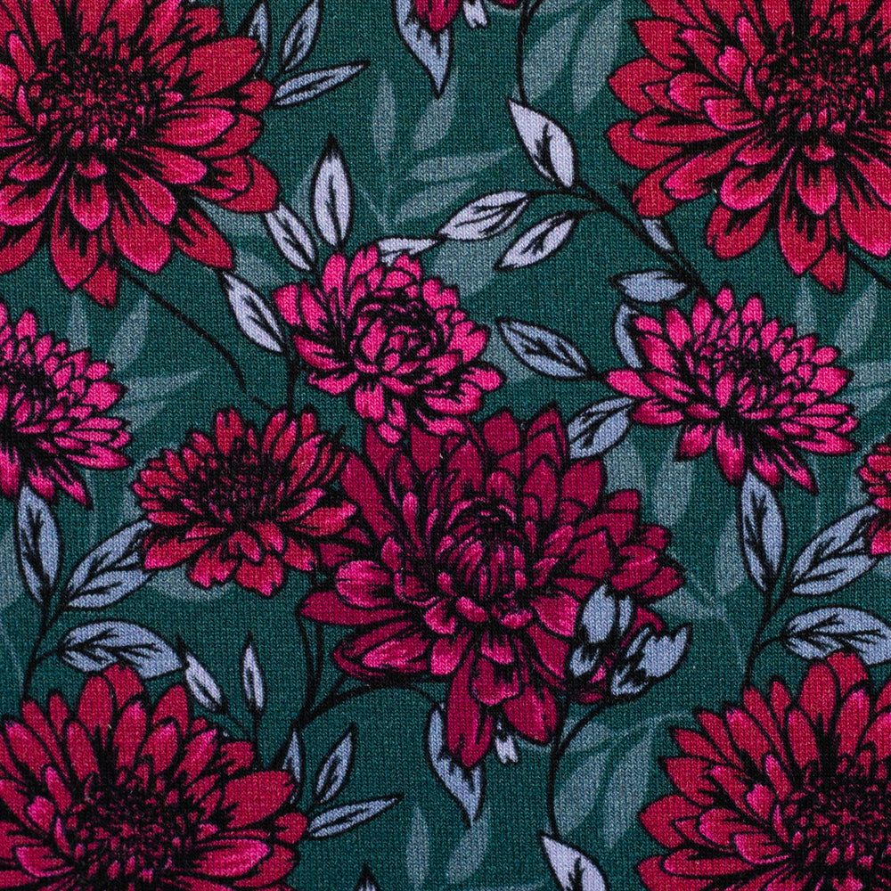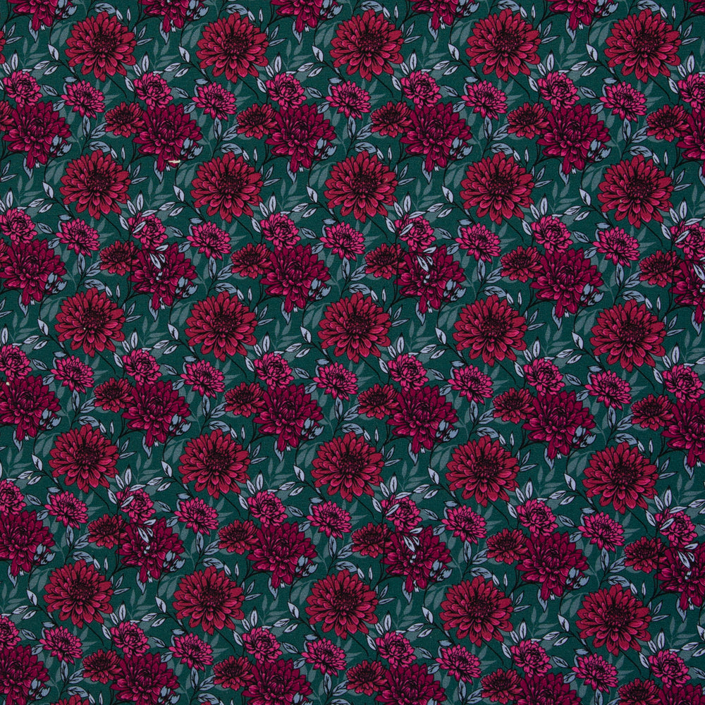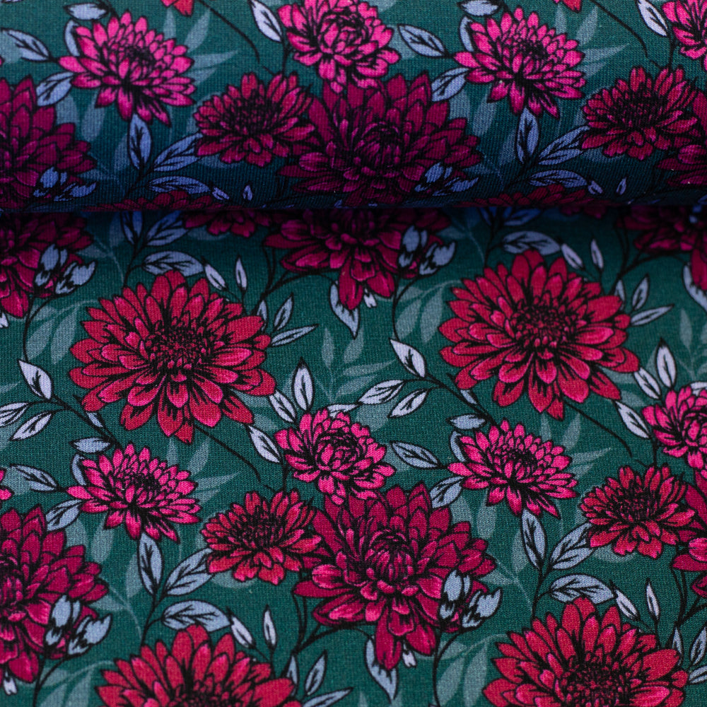 Florale Prints: Blüten in kräftigem Pink auf Pflaume oder Petrol – ein femininer Akzent für Kleider, Tuniken oder feminine Sweater.