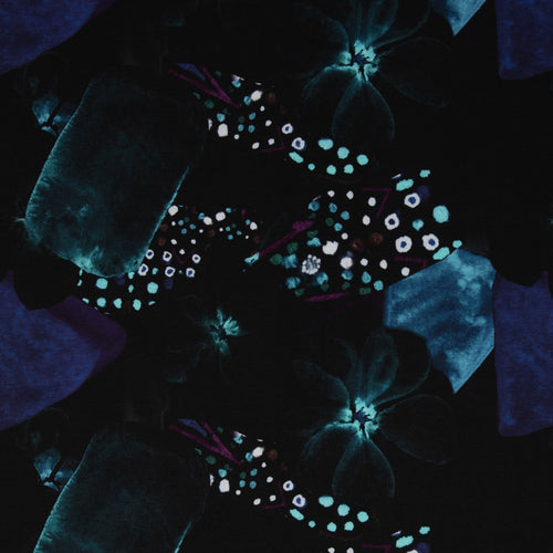 Bei dem gedeckten, abstrakten Design in Schwarz mit Blumen, Punkten und verschiedenen Formen kann man so richtig gut mit den Farben spielen und sie mit Basics aufgreifen und unterstreichen.