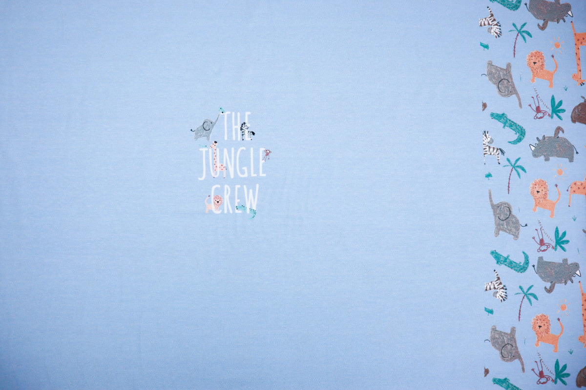 Niedliches Panel mit kleinen Dschungel Tieren und dem Text "THE JUNGLE CREW"