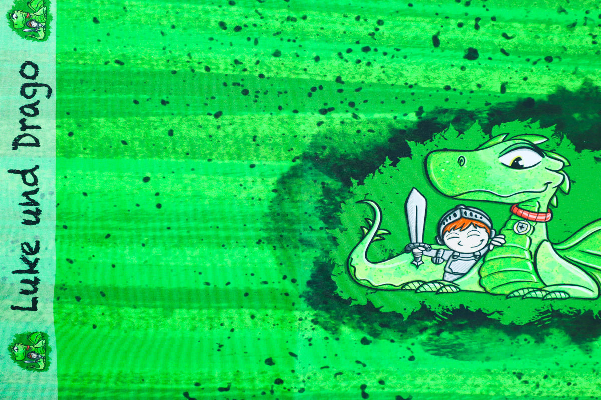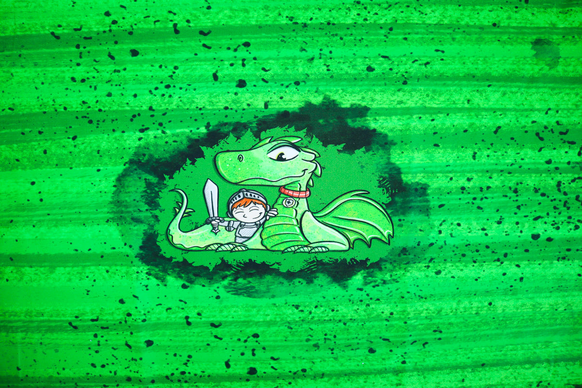 Cooles Panel mit Ritter Luke und seinem Drachen auf giftgrünem Hintergrund.
