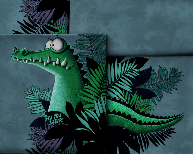 Baumwolljersey Sea You Later: „Sea you later, Alligator“! Kroko Kalle liebt es, im Wasser zu plantschen. Als großes Panelmotiv lauert der knuffige Alligator quasi umlaufend im schattigen Palmenhain auf Vorder- und Rückseite des vernähten Oberteils, um dann in den nächsten Pool zu hüpfen.