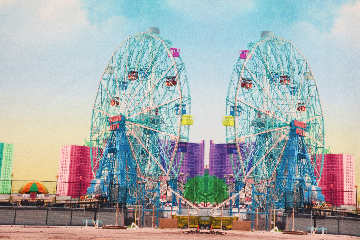 Tolles Canvas-Panel mit zwei Riesenrad vor der Skyline einer bunten Stadt.