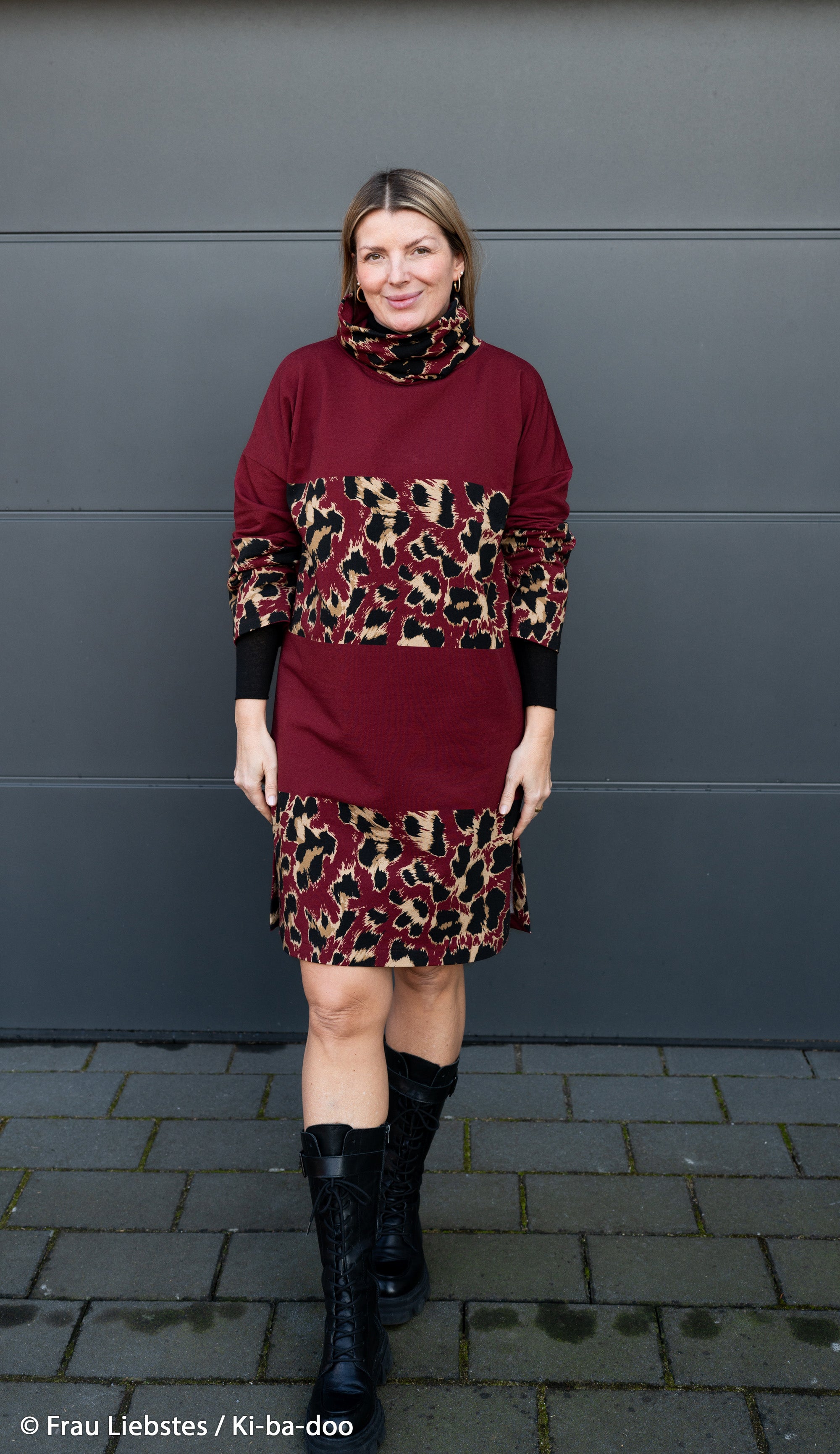 Die Blockstreifen sind KEIN PANEL, sondern ein fortlaufendes Design mit Streifen von ca. 25-26 cm Höhe. Man kann wunderbar mit dem Muster spielen – wie man an den Modellen sieht, wirkt es je nach Anordnung der Streifen auf dem Schnittmuster immer wieder anders!